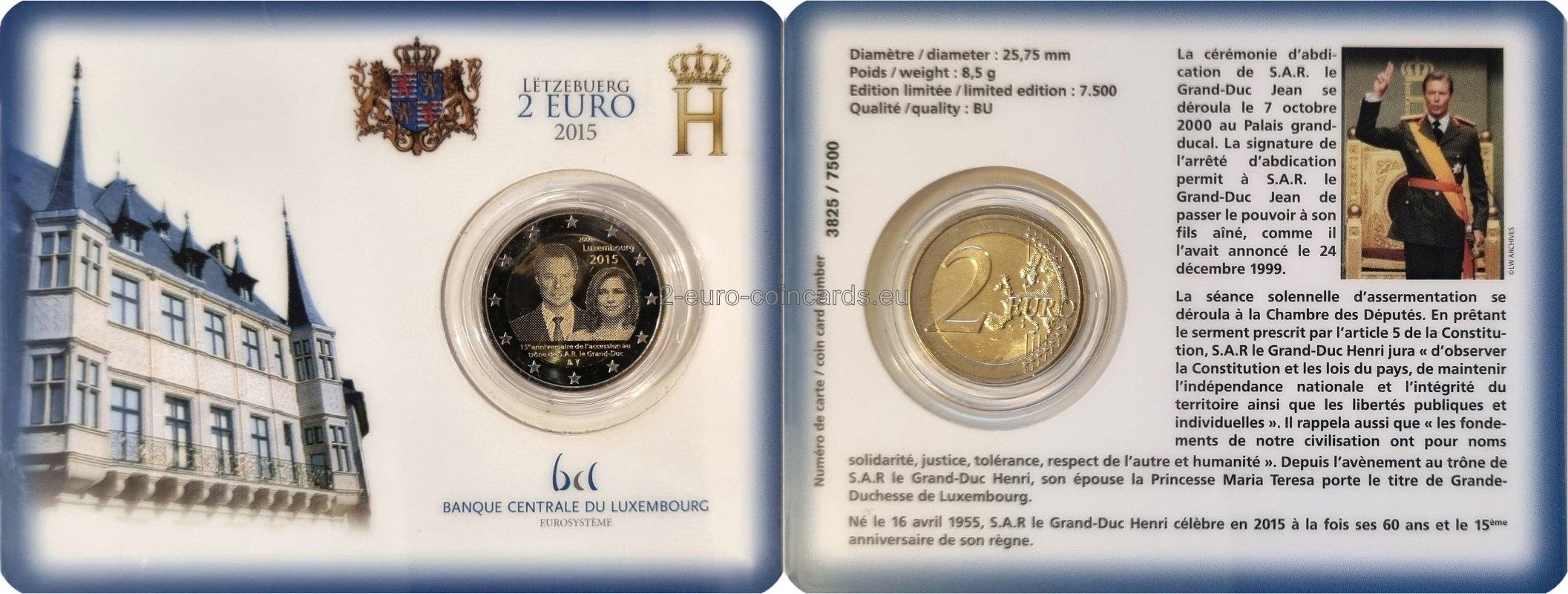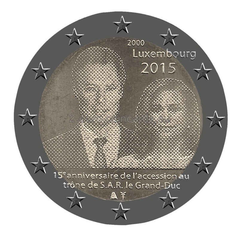 Na minci sú zobrazené podobizne ich kráľovských výsostí veľkovojvodu Henricha a veľkovojvodkyne Márie Terézie, nad nimi je uvedený rok nástupu na trón „2000“, vydávajúca krajina „Luxembourg“, ako aj rok výročia „2015“. V spodnej časti mince je nápis „15e anniversaire de l’accession au trône de S.A.R. le Grand-Duc“ (15. výročie nástupu jeho kráľovskej výsosti veľkovojvodu na trón). Pod ním je znak riaditeľa Holandskej kráľovského mincovne v Utrechte (Maarten Brouwer, plachetnica, vľavo) a znak samotnej mincovne (Merkúrová palica).
