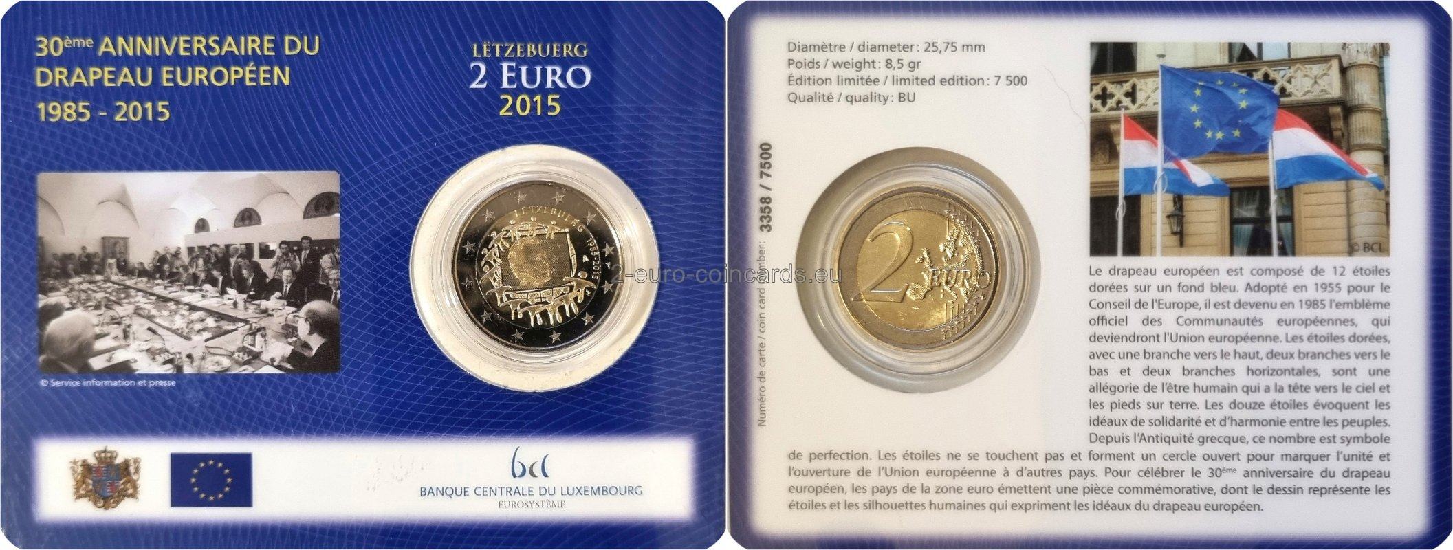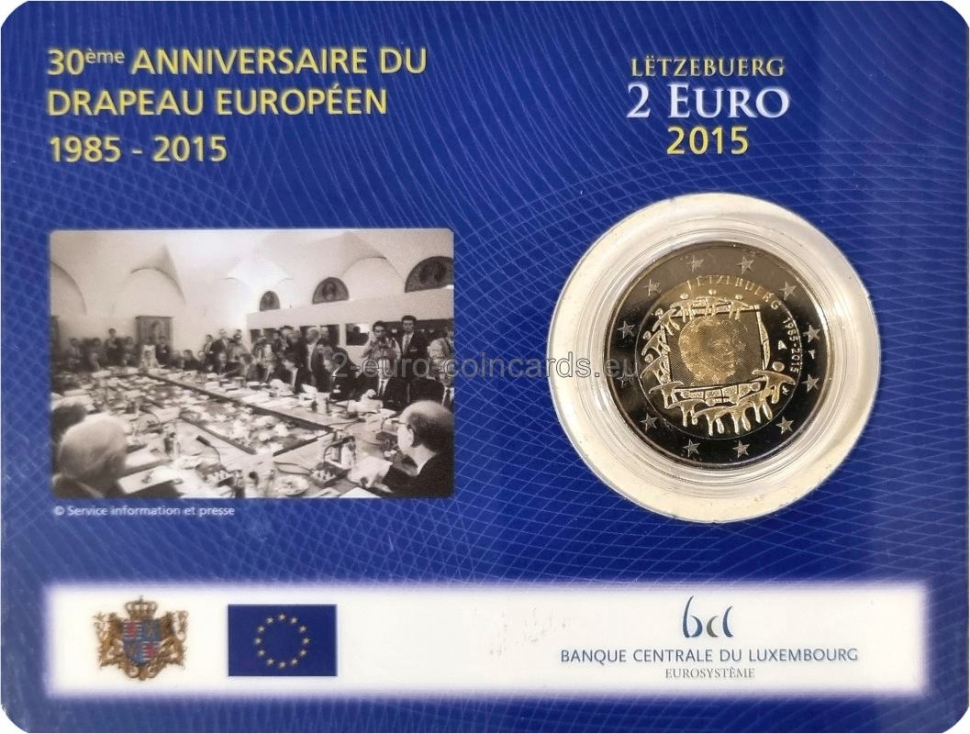 Vzor zobrazuje vlajku EÚ ako symbol, ktorý spája ľudí a kultúry s rovnakými víziami a ideálmi lepšej spoločnej budúcnosti. Dvanásť hviezd, ktoré sa menia na ľudské postavy, predstavuje zrodenie novej Európy. Vpravo hore je v polkruhu uvedený názov vydávajúcej krajiny „LËTZEBUERG“ a roky „1985 – 2015“. Vnútri obrazu vlajky je portrét veľkovojvodu Henricha. Vpravo dolu sa nachádza iniciála umelca Georgiosa Stamatopoulosa (ΓΣ), nad ňou značka riaditeľa Kráľovskej holandskej mincovne v Utrechte (Maarten Brouwer, plachetnica).
