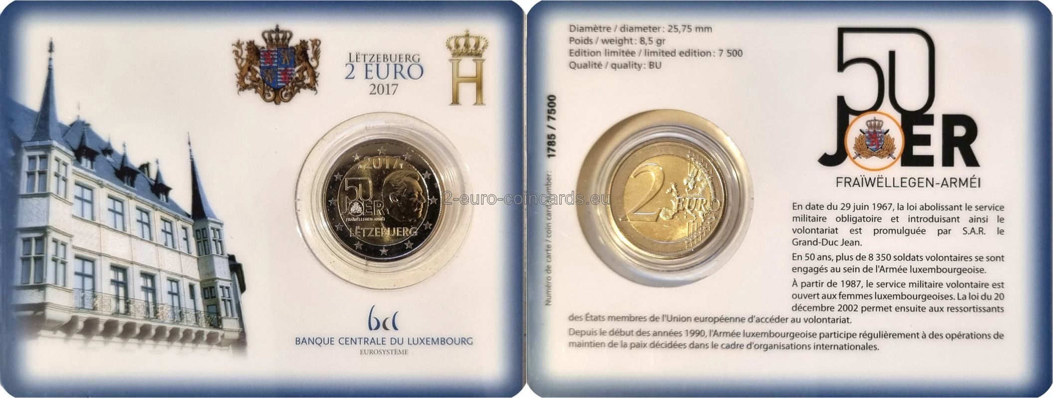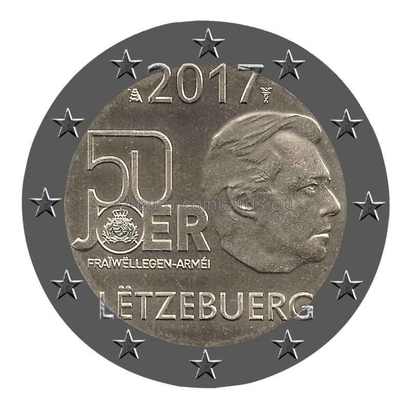 Na pravej strane motívu je znázornená podobizeň jeho kráľovskej výsosti veľkovojvodu Henricha hľadiaceho vpravo a na ľavej strane sa nachádza logo pozostávajúce z textu „50 Joer Fräiwëllegen-Arméi“. V hornej časti motívu sa nachádza rok vydania „2017“ lemovaný značkou Kráľovskej holandskej mincovne v Utrechte (Merkúrová palica) a značkou jej riaditeľa (Maarten Brouwer, plachetnica). V dolnej časti figuruje názov vydávajúcej krajiny „LËTZEBUERG“.