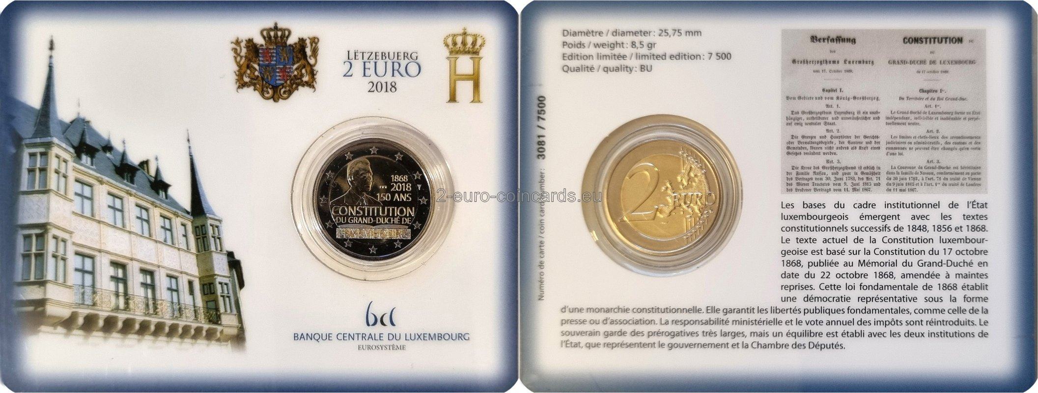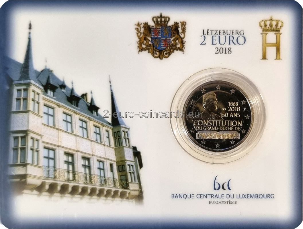 Na ľavej strane vzoru je znázornená podobizeň Jeho kráľovskej výsosti veľkovojvodu Henricha hľadiaceho vpravo. Na pravej strane vzoru sú uvedené letopočty „1868 – 2018“ a text „150 ans“ (150 rokov). Pod podobizňou veľkovojvodu sa nachádza text „Constitution du Grand-Duché de Luxembourg“ (Ústava Luxemburského veľkovojvodstva) a bočný pohľad na otvorenú knihu. Naľavo od letopočtu 2018 sa nachádza značka riaditeľa Kráľovskej holandskej mincovne v Utrechte (Stephan Satijn, most) a napravo značka mincovne (Merkúrová palica).