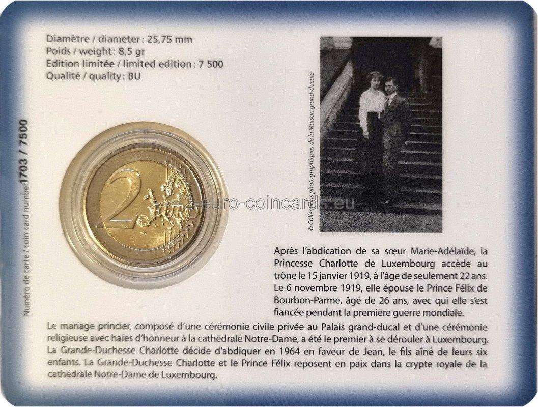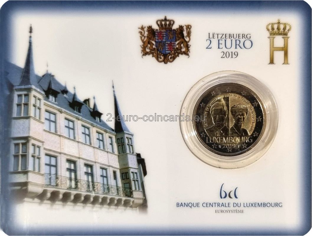 Na ľavej strane mince je vyobrazená podobizeň jeho kráľovskej výsosti veľkovojvodu Henricha a na pravej strane je podobizeň veľkovojvodkyne Šarloty. V spodnej časti mince je uvedený názov vydávajúcej krajiny „LUXEMBOURG“ a pod ním rok vydania „2019“. Vo vrchnej časti je v polkruhu okolo portrétov uvedený nápis „Centenaire de l’accession au trône de la Grande-Duchesse Charlotte“ (storočnica nástupu veľkovojvodkyne Šarloty na trón). Naľavo od letopočtu 2019 sa nachádza značka Lev (heraldický lev Luxemburska) a napravo značka mincovne (Merkúrová palica).