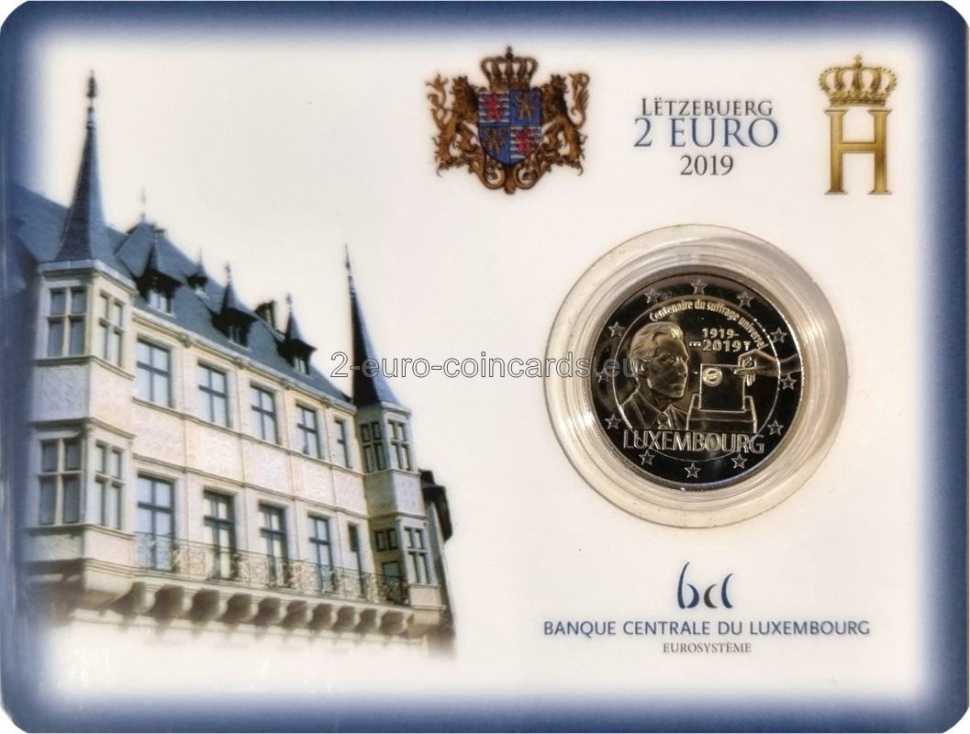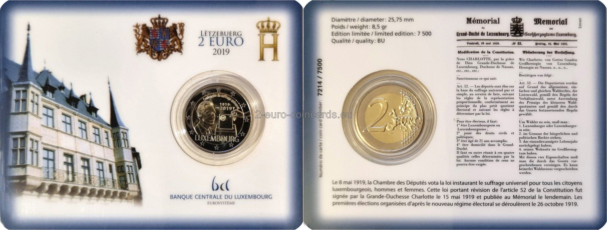 Na ľavej strane mince je vyobrazená podobizeň jeho kráľovskej výsosti veľkovojvodu Henricha a na pravej strane je zobrazená ruka, ktorá do volebnej urny vhadzuje volebný lístok. V dolnej časti mince je uvedený názov vydávajúcej krajiny „LUXEMBOURG“. V hornej časti je v polkruhu uvedený nápis „Centenaire du suffrage universel“ (sté výročie všeobecného volebného práva), pod ktorým sa nachádzajú letopočty „1919 – 2019“, pričom rok 2019 označuje rok vydania. Naľavo od letopočtu 2019 sa nachádza značka riaditeľa Kráľovskej holandskej mincovne v Utrechte (Stephan Satijn, most) a napravo značka mincovne (Merkúrová palica).