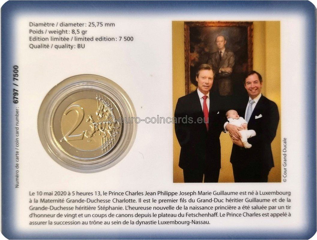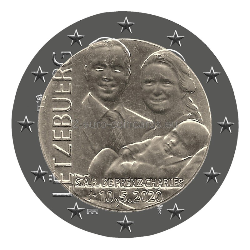 V strede vzoru je vyobrazený princ Karol a podobizne jeho rodičov – Ich kráľovských Výsostí dedičného veľkovojvodu Viliama a dedičnej veľkovojvodkyne Štefánie. Na ľavej strane je zvisle vpísaný názov vydávajúcej krajiny „LËTZEBUERG“. Monogram (písmeno „H“ s korunou) je symbolom veľkovojvodu Henricha. Pod podobizňami je text „S.A.R. de Prënz Charles“ (Jeho kráľovská Výsosť princ Karol) a dátum princovho narodenia „☆ 10.5.2020“. Pod dátumom sa vľavo nachádza značka riaditeľa Kráľovskej holandskej mincovne v Utrechte (Stephan Satijn, most) a napravo značka mincovne (Merkúrová palica).