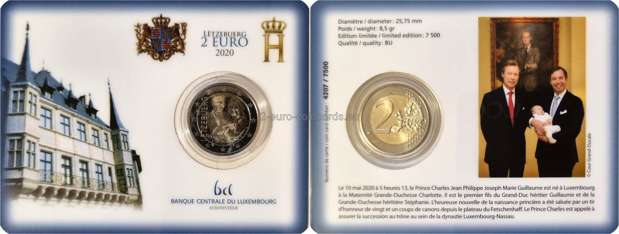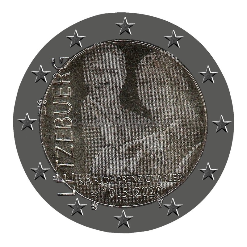 V strede vzoru je vyobrazený princ Karol a podobizne jeho rodičov – Ich kráľovských Výsostí dedičného veľkovojvodu Viliama a dedičnej veľkovojvodkyne Štefánie. Na ľavej strane je zvisle vpísaný názov vydávajúcej krajiny „LËTZEBUERG“. Monogram (písmeno „H“ s korunou) je symbolom veľkovojvodu Henricha. Pod podobizňami je text „S.A.R. de Prënz Charles“ (Jeho kráľovská Výsosť princ Karol) a dátum princovho narodenia „☆ 10.5.2020“. Pod dátumom sa vľavo nachádza značka riaditeľa Kráľovskej holandskej mincovne v Utrechte (Stephan Satijn, most) a napravo značka mincovne (Merkúrová palica).