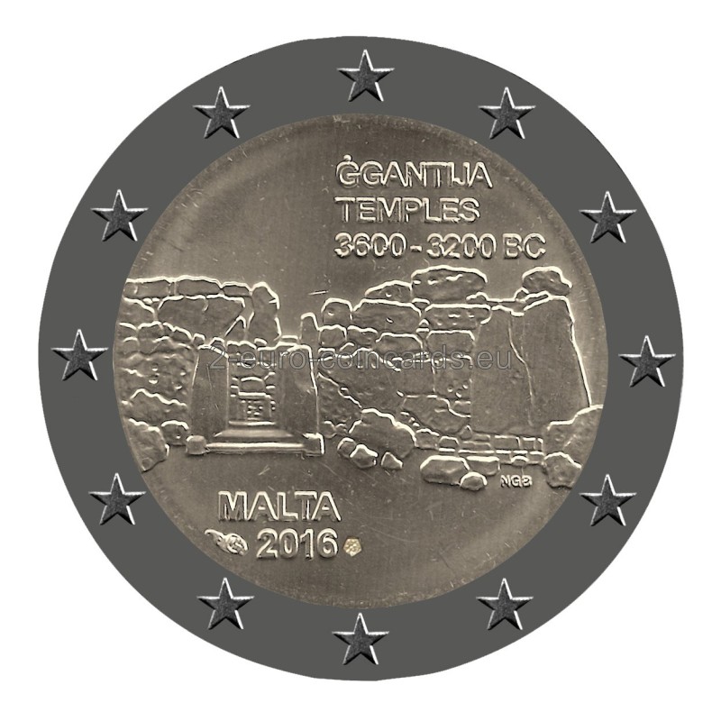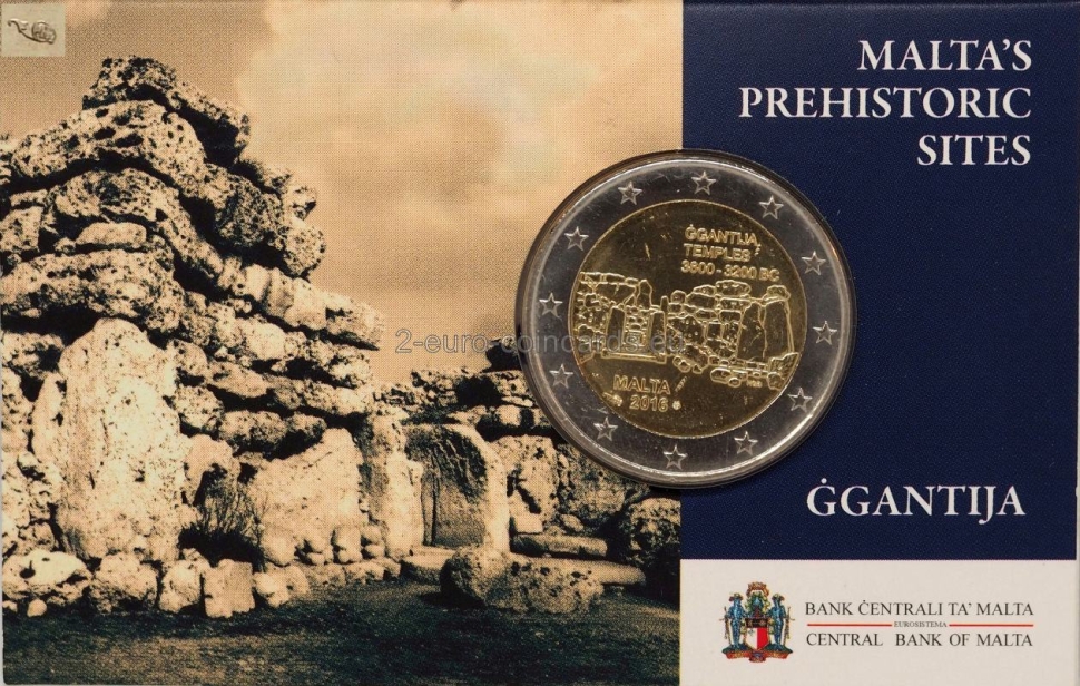Na minci je vyobrazené chrám Ġgantija nachádzajúci sa na ostrove Gozo. Názvom Ġgantija (Veža obrov) je pomenovaný megalitický chrámový komplex pochádzajúci z neolitu. Ide o jednu z najstarších samostatne stojacich stavieb a zároveň o jednu z najstarších náboženských stavieb. Chrámy Ġgantija boli postavené približne v 36. storočí p. n. l, čo znamená, že sú staršie ako Stonehenge a egyptské pyramídy. Chrámový komplex Ġgantija sa nachádza na náhornej plošine Šaara. Ako všetky maltské chrámy postavené z megalitov má juhovýchodnú orientáciu. Má tvar trojlístka. Sály sú postavené tesne vedľa seba a ohradené ďalšou stenou zo zvislých megalitických blokov. Jednotlivé kamene múru sa týčia do výšky 5,5 metra a vážia približne 50 ton. Najväčší južný chrám je zároveň najstarší. Ten pochádza z obdobia približne 3600 rokov pred n. l. Lepšie zachovaná časť stavby na rozdiel od severného chrámu umožňuje archeológom rekonštruovať pôvodné formy megalitickej stavby. Vnútorná dispozícia chrámu zahŕňa 5 veľkých apsid. Pri stavbe chrámu použili starovekí architekti kyklopský štýl muriva. Inými slovami, stavba sa realizovala bez malty a jednotlivé kamenné bloky sa pre svoju veľkú hmotnosť v konštrukcii udržiavali a nerovnosti stien stavitelia odstraňovali pomocou omietky. Výstavba komplexu prebiehala v čase, keď ešte nebolo vynájdené koleso, a bez použitia kovových nástrojov. Archeológovia našli neďaleko komplexu kamenné gule. Predpokladá sa, že pomohli starovekým staviteľom premiestniť veľké bloky na miesto, kde boli postavené chrámy. Južný chrám sa týči 6 metrov nad zemou. Neďaleko vchodu sa našiel veľký blok, v ktorom bola špeciálne vytvorená dutina. Mohol sa používať ako nádrž na očistenie pred vstupom do chrámu. V každej z piatich apsid boli oltáre na obetovanie zvierat a ich kosti sa našli v blízkosti obetných miest. Pri archeologickom výskume sa objavilo aj množstvo sôch zasvätených bohom plodnosti, čo umožnilo vedcom navrhnúť, že chrámy na ostrove Gozo patrili tomuto kultu. O existencii chrámového komplexu dlho vedeli len miestni obyvatelia a dobrodruhovia. V roku 1827 však plukovník John Otto Bayer, ktorý pôsobil ako zástupca guvernéra ostrova Gozo, vydal príkaz na vyčistenie ruín. Je pravda, že potom pozostatky starobylej stavby chátrali. Okrem toho boli staroveké chrámy očistené od trosiek spolu s vrchnou vrstvou pôdy, ktorá mohla obsahovať neoceniteľný výskumný materiál pre archeológov. Preto sa mnohé veci museli obnoviť len vďaka úsiliu umelcov, ktorým sa podarilo zachytiť chrámový komplex pred jeho "vyčistením". Napríklad koncom 18. storočia navštívil Gozo francúzsky maliar Jean-Pierre Owel. A len niekoľko rokov pred začiatkom "očistných" prác megalitickú pamiatku do najmenších detailov zobrazil maliar Frederick Charles de Brochtorff. V roku 1925 bola Ġgantija zapísaná na zoznam pamiatok, čo však až do roku 1933 nebránilo tomu, aby bol chrámový komplex v súkromnom vlastníctve. Hĺbkový výskum chrámov na ostrove Gozo sa začal po tom, ako Ministerstvo múzeí iniciovalo vykopávky, ktoré sa uskutočnili v 30. a 50. rokoch 20. storočia. Hlavnou úlohou vedcov bolo vyčistiť megalitickú stavbu a jej okolie a pamiatku zachovať a preskúmať. V roku 1980 bola Ġgantija zapísaná do Zoznamu svetového dedičstva UNESCO. O dvanásť rokov neskôr bolo na zoznam pridaných ďalších päť megalitických stavieb z Malty, po ktorých chránená lokalita dostala názov "Megalitické chrámy Malty". Chrámový komplex a jeho okolie boli obnovené v roku 2000. V roku 2011 tu boli nainštalované svetelné chodníky a v roku 2013 je lokalita otvorená pre prehliadky so sprievodcom.