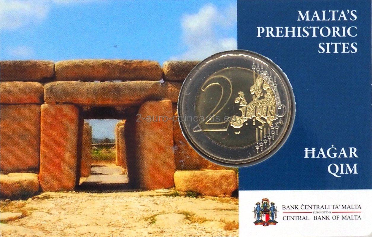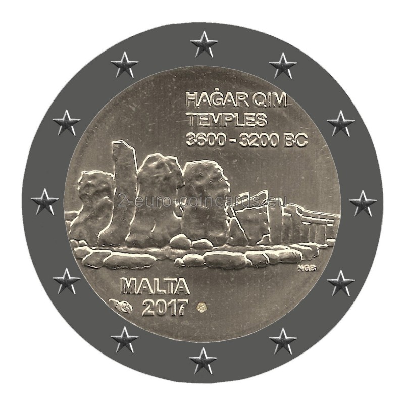 Na minci sú vyobrazené prehistorické chrámy Ħaġar Qim. V pravej hornej časti sú pod sebou uvedené nápisy „ĦAGAR QIM“ a „TEMPLES“ a pod nimi roky „3600-3200 BC“. Vľavo dole sa nachádza názov vydávajúcej krajiny „MALTA“ a pod ním rok vydania „2017“. Vpravo dole sú iniciály umelca „NGB“ (Noel Galea Bason). Okolo letopočtu 2017 sa nachádzajú značky Parížskej mincovne Pesssac, (roh hojnosti), a jej vedúceho rytca Yves Sampo, (päťuholník).