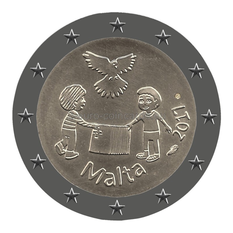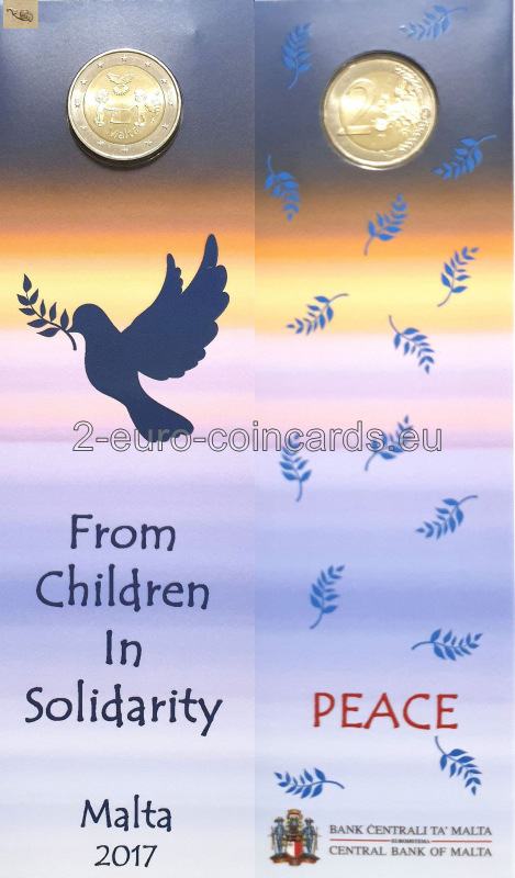 Motívom tejto mince je solidarita a mier. Autorom motívu je študent, a tento motív znázorňuje dve deti, ktoré držia maltskú vlajku, a holubicu mieru, ktorá letí ponad ne. V spodnej časti sa nachádza názov vydávajúcej krajiny „Malta“ a na pravej strane rok vydania „2017“. Okolo textu 2017 sa nachádzajú značky Parížskej mincovne Pessac (roh hojnosti, vľavo) a jej hlavného rytca (Yves Sampo, päťuholník, vpravo). Minca bola vydaná v blistri v tvare záložky do knihy.