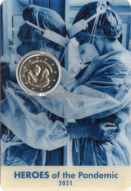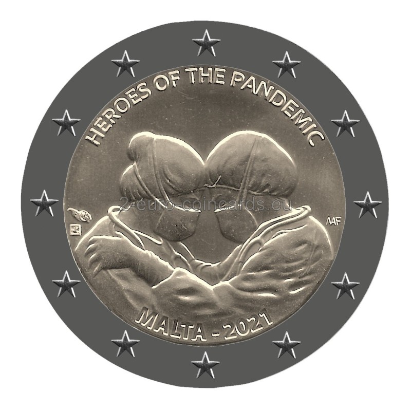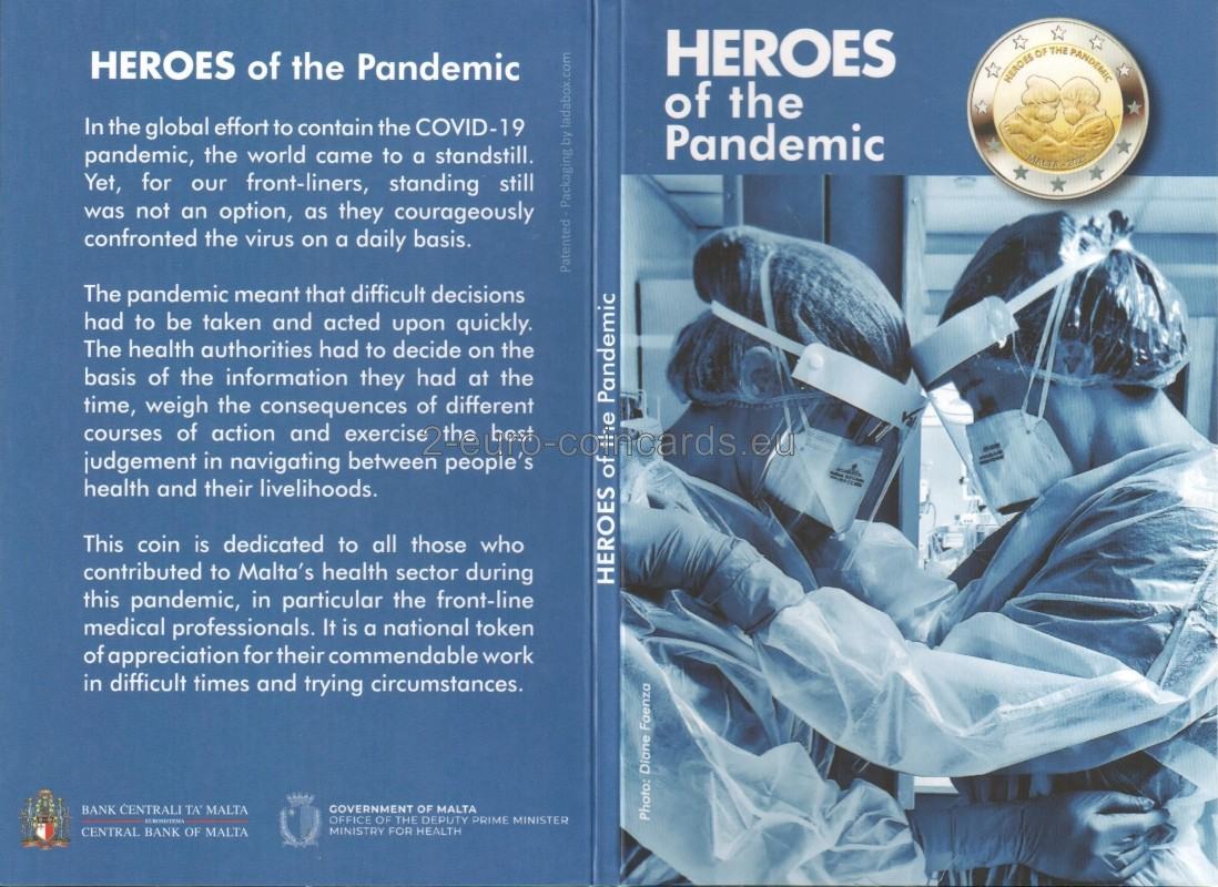 Predlohou návrhu mince bola fotografia dvoch maltských zdravotných sestier, Doreen Zammitovej a Charmaine Cauchiovej, zhotovená v nemocnici Mater Dei v apríli 2020 počas prvej vlny COVID-19. Fotografiu urobila zdravotná sestra Diane Faenza a uverejnila ju vo facebookovej galérii Times of Malta, po ktorej získala popularitu a stala sa symbolom boja proti pandémii. Jeho cieľom je vzdať úctu týmto obetavým jednotlivcom, ktorí stáli na čele boja proti pandémii COVID-19. Na vnútornom disku sú zobrazené dve sestry v ochranných oblekoch, ktoré sa objímajú. V hornej časti je v polkruhu uvedený nápis „HEROES OF THE PANDEMIC“ (HRDINOVIA PANDÉMIE). V dolnej časti je v polkruhu uvedený nápis „MALTA – 2021“. Vľavo od obrazu sa nachádzajú značka Parížskej mincovne Pessac (roh hojnosti, hore) a pod ňou značka jej hlavného rytca (Joaquin Jimenez, štvorec s malým štvorcom v ľavom hornom rohu).