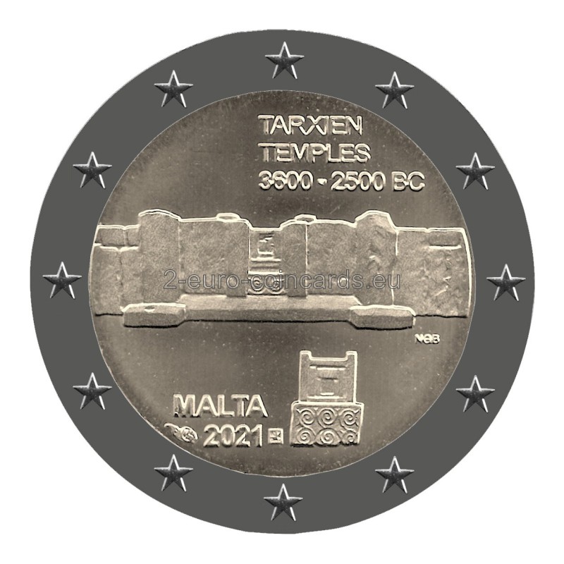 Na minci je vyobrazený detail prehistorickej stavby. V hornej časti je nápis „TARXIEN TEMPLES 3600 – 2500 BC“. V dolnej časti sa nachádza názov vydávajúcej krajiny „MALTA“ a pod ním rok vydania „2021“. Okolo roku vydania sa nachádzajú značky Parížskej mincovne Pesssac, roh hojnosti, jej hlavného rytca, Joaquin Jimenez, štvorec s malým štvorcom v ľavom hornom rohu. Vpravo je zobrazený antický oltár. Vpravo sú tiež iniciály autora "NGB" (Noel Galeu Bason).