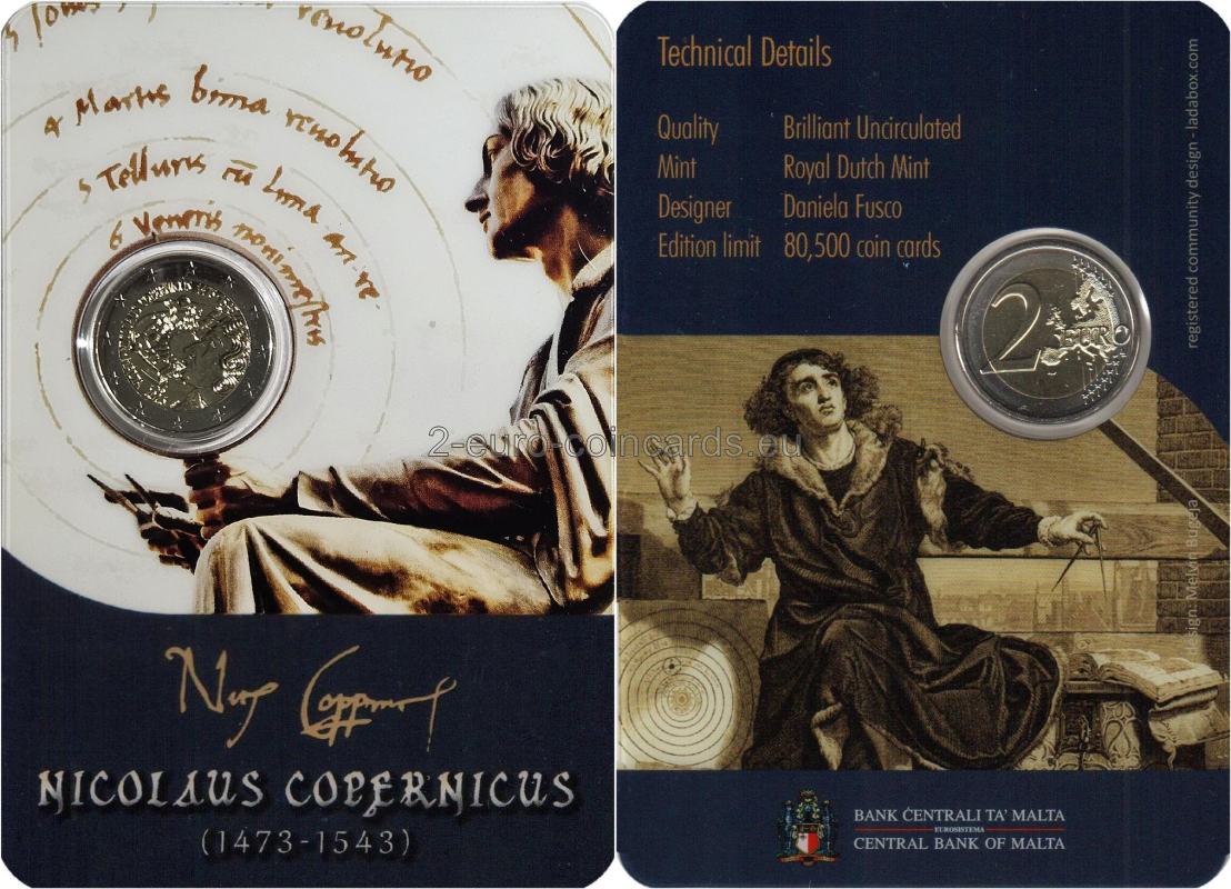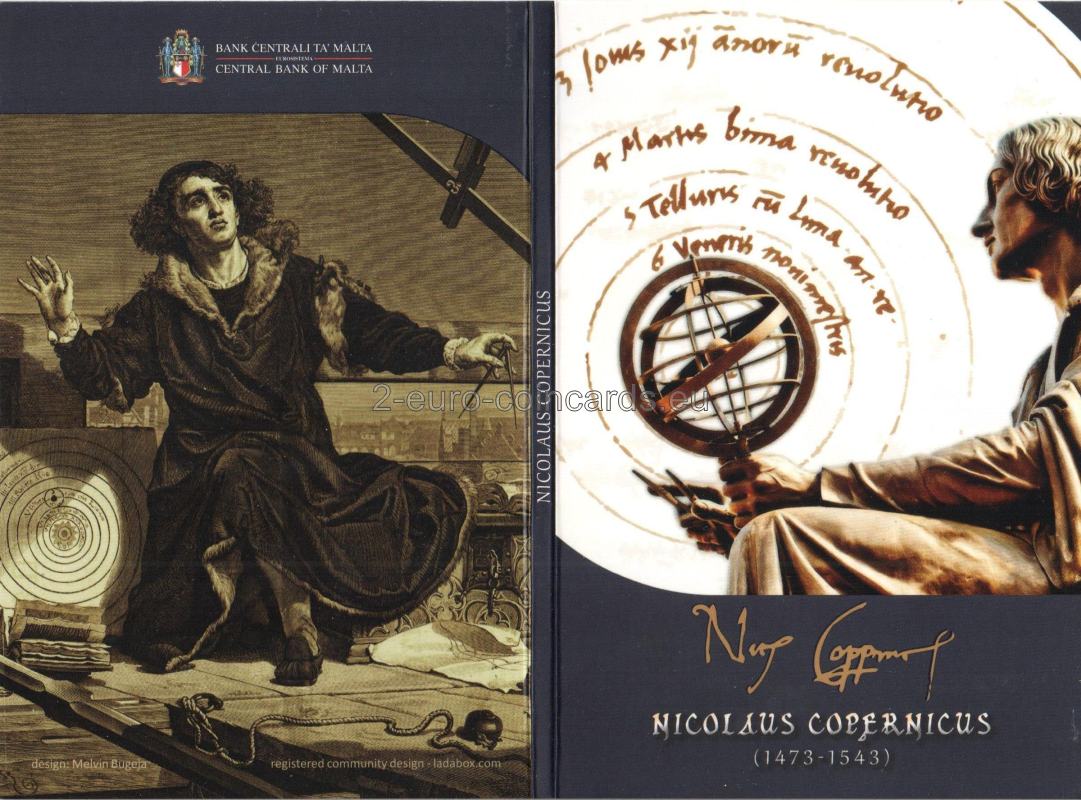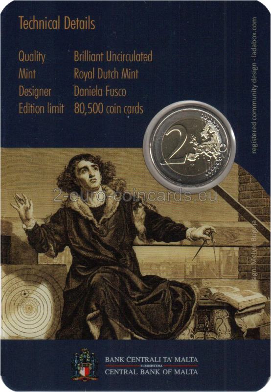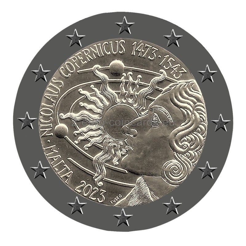 Na minci je vyobrazený portrét Kopernika z profilu a štylizované heliocentrické zobrazenie vesmíru podľa jeho návrhu. Vľavo hore sa nachádza nápis „NICOLAUS COPERNICUS 1473 – 1543“, vľavo dole je názov vydávajúcej krajiny „MALTA“ a rok vydania „2023“. Takisto v dolnej časti sa nachádza podpis umelkyne Daniely Fuscoovej „FUSCO“.