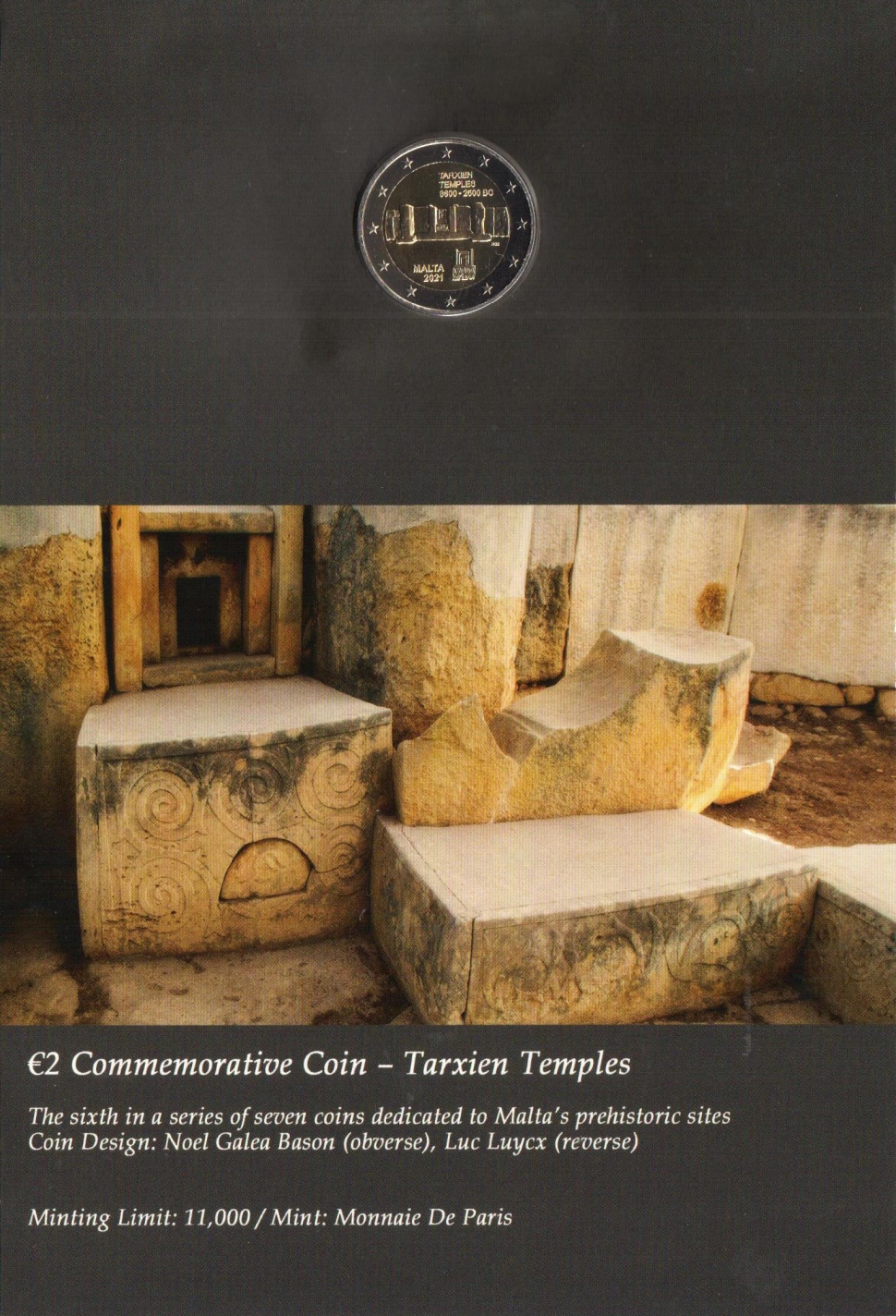 Na minci je vyobrazený detail prehistorickej stavby. V hornej časti je nápis „TARXIEN TEMPLES 3600 – 2500 BC“. V dolnej časti sa nachádza názov vydávajúcej krajiny „MALTA“ a pod ním rok vydania „2021“. Okolo roku vydania sa nachádzajú značky Parížskej mincovne Pesssac, roh hojnosti, jej hlavného rytca, Joaquin Jimenez, štvorec s malým štvorcom v ľavom hornom rohu. Vpravo je zobrazený antický oltár. Vpravo sú tiež iniciály autora "NGB" (Noel Galeu Bason).
