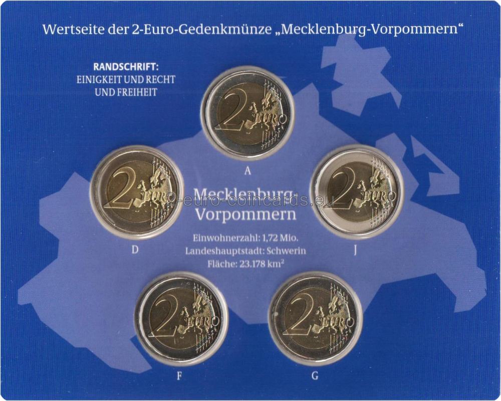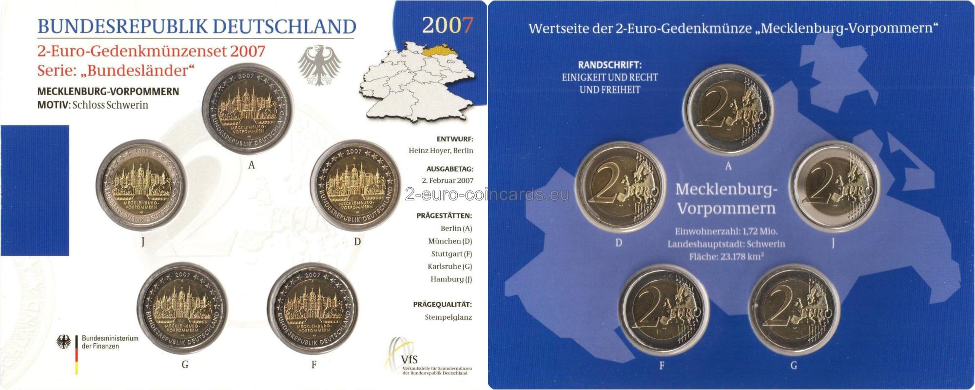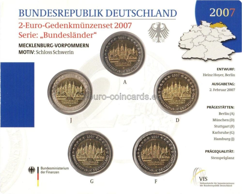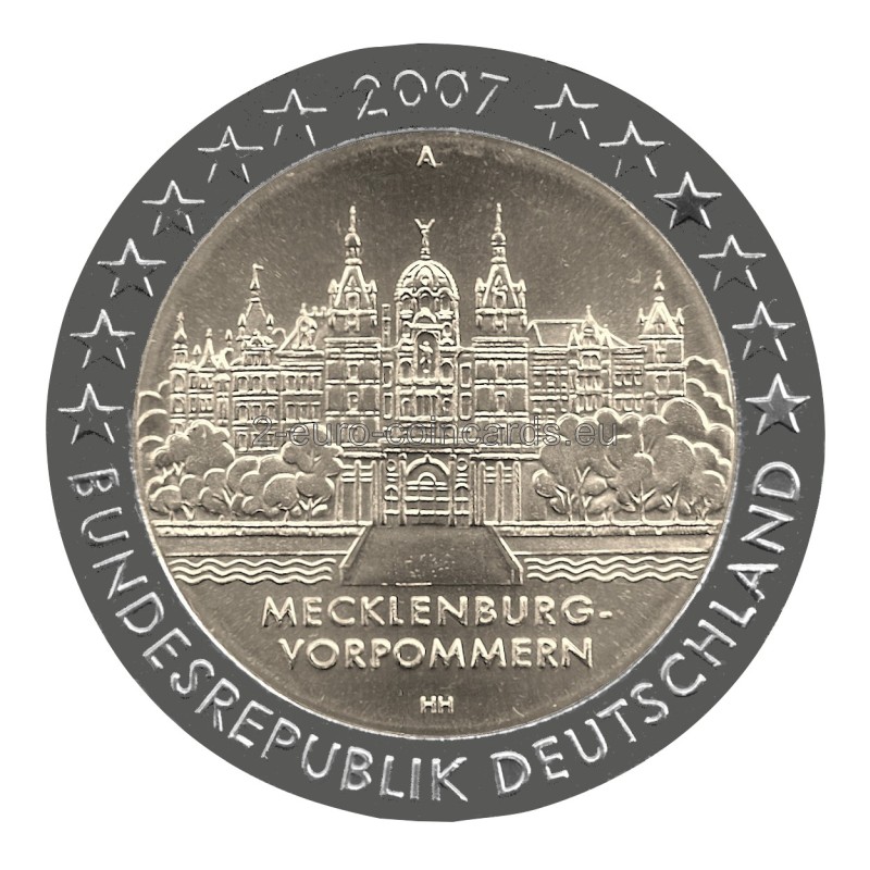 Vnútorná časť mince zobrazuje Schwerinský zámok. Pod ním je vyrytý názov „MECKLENBURG-VORPOMMERN“ a iniciály rytca Heinza Hoyera (HH) sa nachádzajú na spodku vnútornej časti mince. Nad motívom sa nachádza značka príslušnej mincovne, vyjadrená písmenami A, D, F, G alebo J. V hornej časti vonkajšieho prstenca mince je vyobrazených dvanásť hviezd ktoré rozdeľuje letopočet razby „2007“. Slová „Bundesrepublik Deutschland“ vytvárajú polkruh v dolnej časti vonkajšieho prstenca. Dvanásť hviezd vlajky Európskej únie symbolizuje dokonalosť, celistvosť a ideál jednoty a pripomína aj počet mesiacov a ciferník.