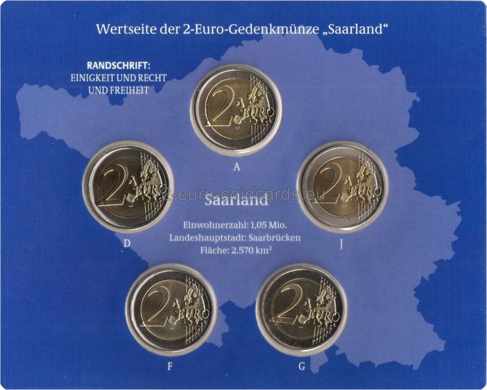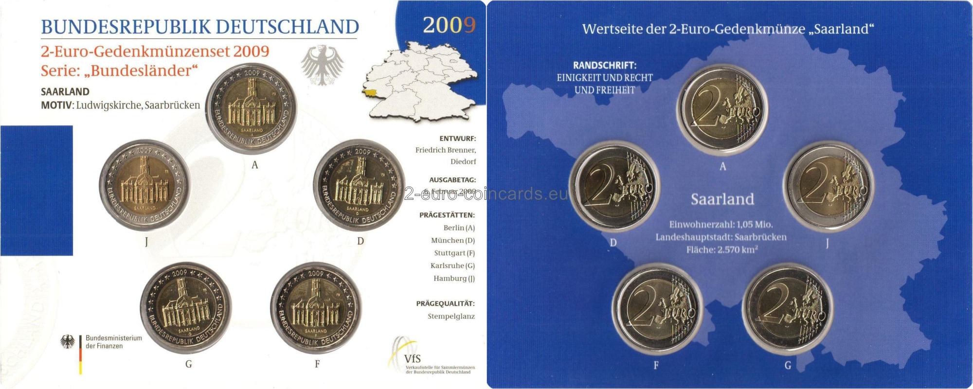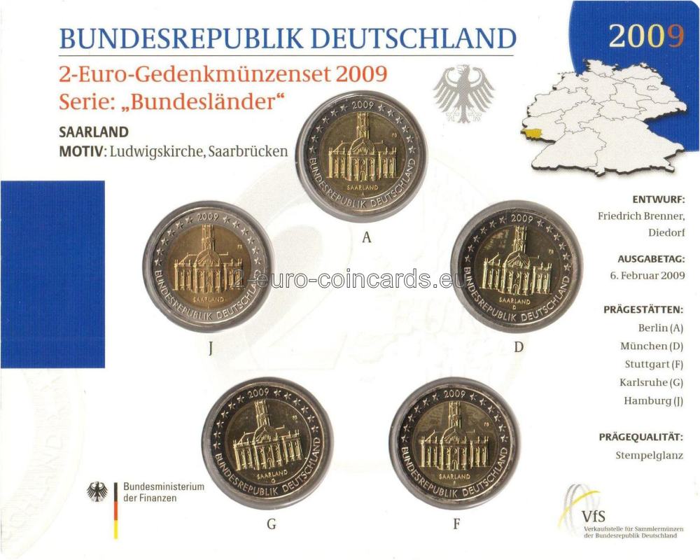Vo vnútornej časti mince je vyobrazený kostol Svätého Ľudovíta v Sarrebrucku. Pod ním je názov krajiny „SAARLAND“ a značka príslušnej mincovne – jedno z písmen A, D, F, G alebo J. Na pravo od vyobrazenia kostola sa nachádzajú iniciály rytca Friedricha Brennera „FB“. V hornej časti vonkajšieho prstenca mince je vyobrazených dvanásť hviezd ktoré rozdeľuje letopočet razby „2009“. Slová „Bundesrepublik Deutschland“ vytvárajú polkruh v dolnej časti vonkajšieho prstenca. Dvanásť hviezd vlajky Európskej únie symbolizuje dokonalosť, celistvosť a ideál jednoty a pripomína aj počet mesiacov a ciferník.