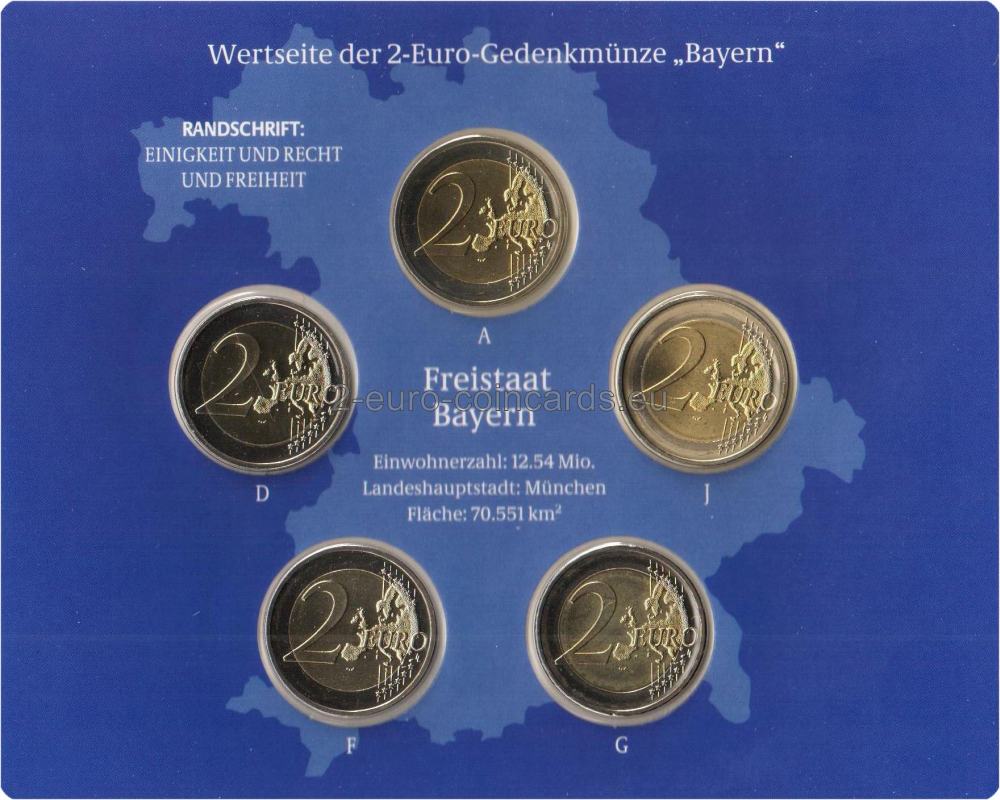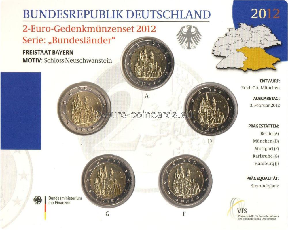 Na minci je zobrazený najznámejší pohľad na zámok Neuschwanstein. Je to pohľad z východu, ktorý vidia návštevníci pri výstupe k zámku so strážnym domom pri bráne v popredí a vežami a vežičkami inšpirovanými stredovekou architektúrou. Umelec verne zachytil panoramatické pohorie za zámkom aj polohu zámku na brale nad romantickou roklinou Pöllatschlucht. Názov „BAYERN“ (Bavorsko) spája zobrazenie zámku Neuschwanstein s touto spolkovou krajinou. Značka príslušnej mincovne – jedno z písmen A, D, F, G alebo J sa nachádza v strednej časti napravo a iniciály umelca Ericha Otta „Œ" v strednej časti naľavo.