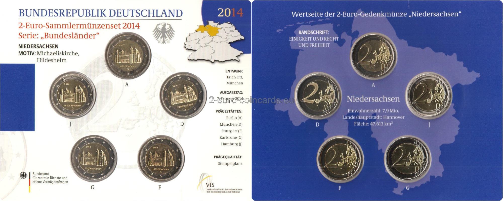 Na vzore je vyobrazený kostol svätého Michala v Hildesheime v Dolnom Sasku. V hornej časti je rok vydania „2014“ a v ľavej časti značka príslušnej mincovne, vyjadrená písmenami A, D, F, G alebo J. V dolnej časti sa nachádza nápis „NIEDERSACHSEN“ a pod ním označenie vydávajúcej krajiny D. Vpravo hore sa nachádzajú iniciály rytca Otta Ericha „Œ".