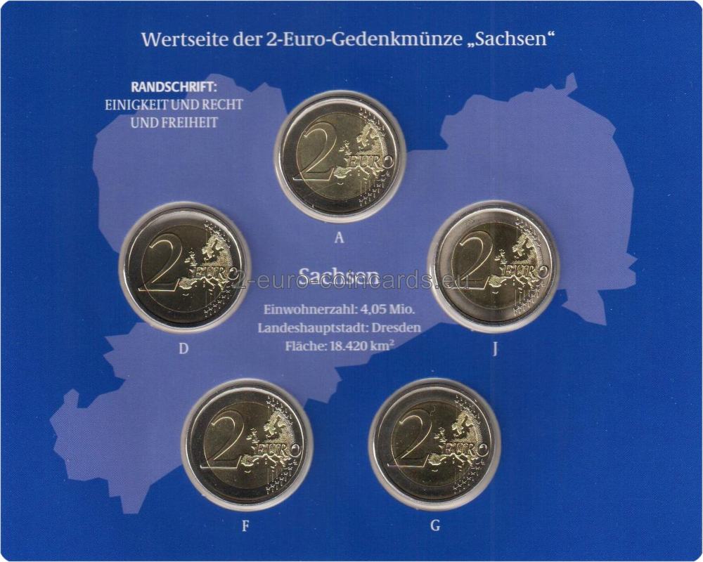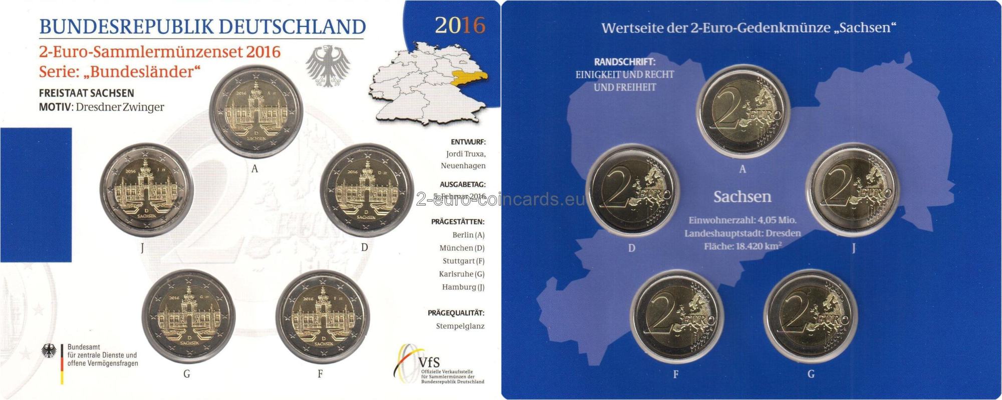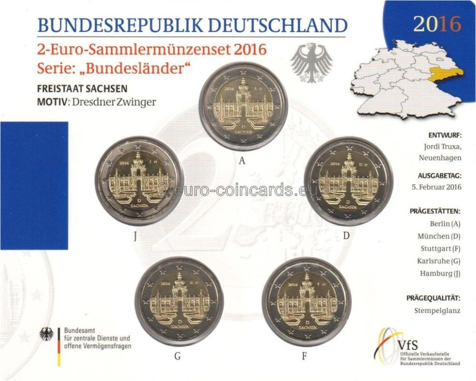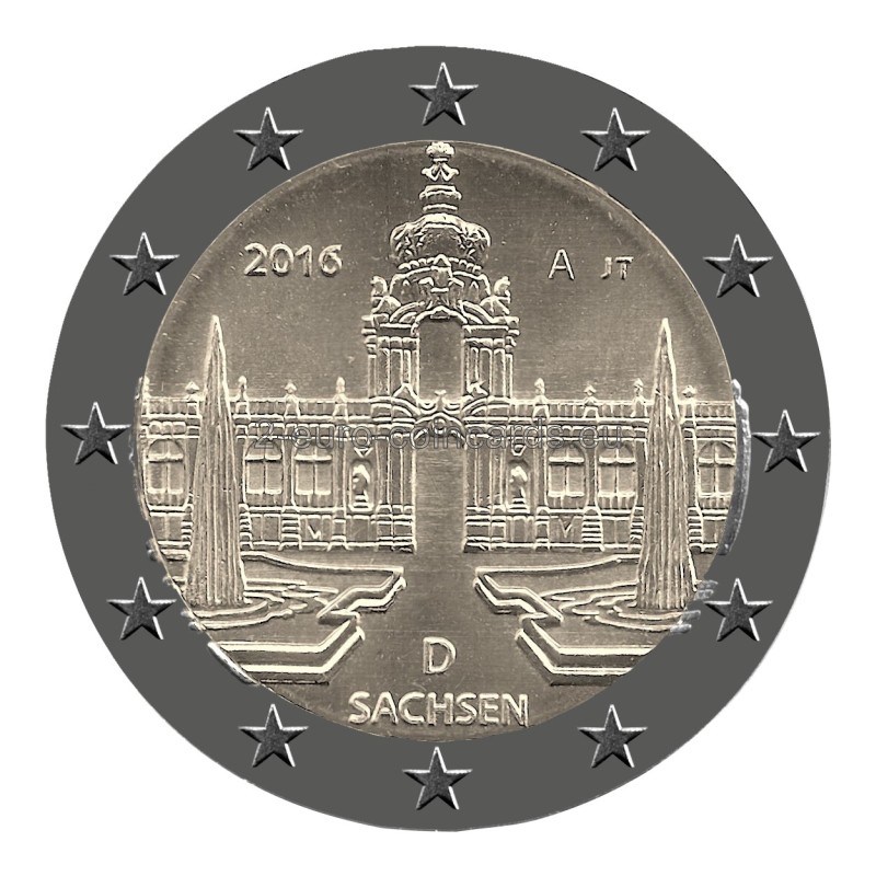 Na vzore je vyobrazený pohľad z vnútorného nádvoria svetoznámeho paláca Zwinger v Drážďanoch na Korunnú bránu. Na spodku vnútornej časti sa ďalej nachádza názov „SACHSEN“ a kód vydávajúcej krajiny „D“, v pravej hornej časti je vyobrazená značka mincovne, vyjadrená písmenami A, D, F, G alebo J, ako aj značka rytca (iniciály „JT“ – Jordi Truxa), a v ľavej hornej časti je uvedený rok „2016“.