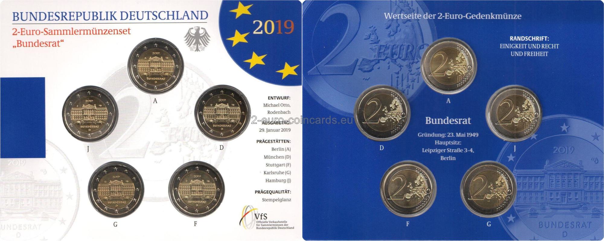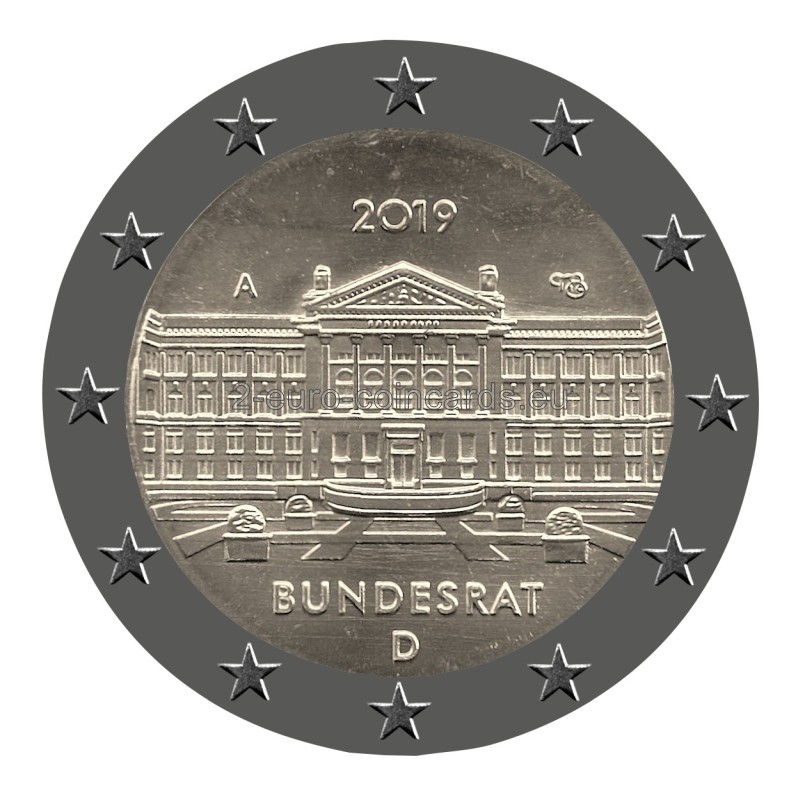 Vzor veľmi detailne a filigránsky zobrazuje budovu Spolkovej rady. Vo vnútornej časti mince sa hore nachádza značka mincovne, vyjadrená písmenami A, D, F, G alebo J, iniciály umelca a rok „2019“. V spodnej časti vnútorného kruhu mince je uvedený nápis „BUNDESRAT“ a kód vydávajúcej krajiny Nemecko „D“.