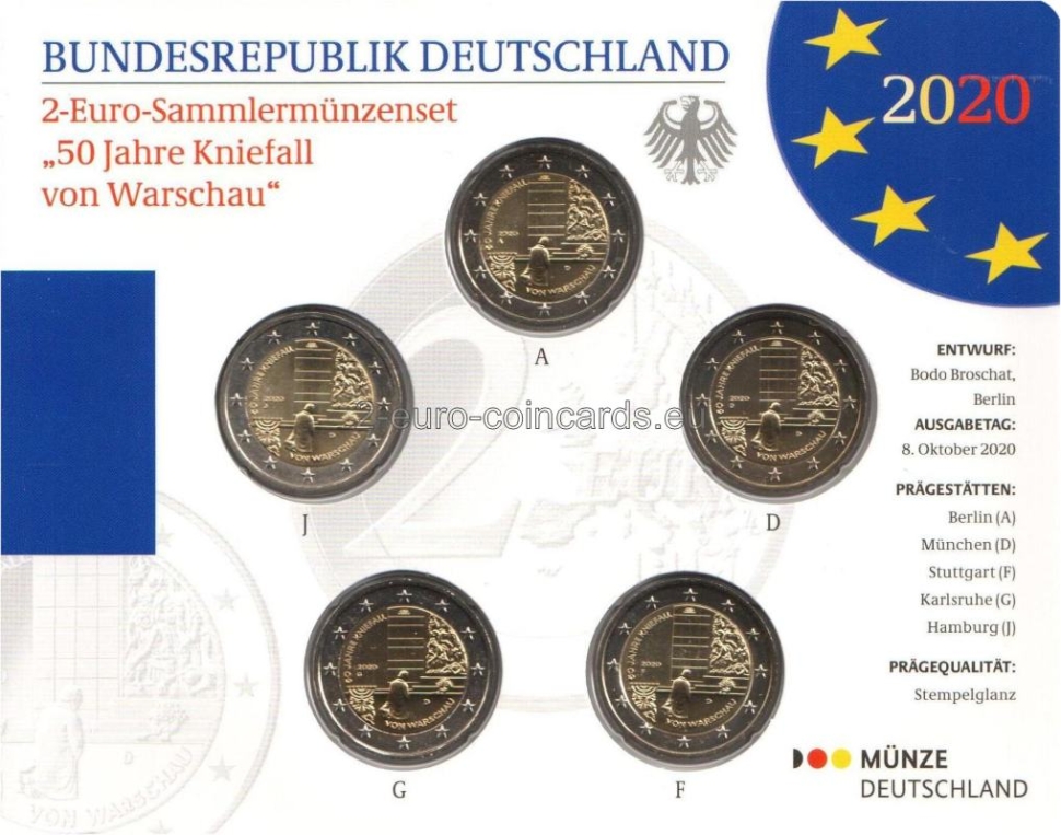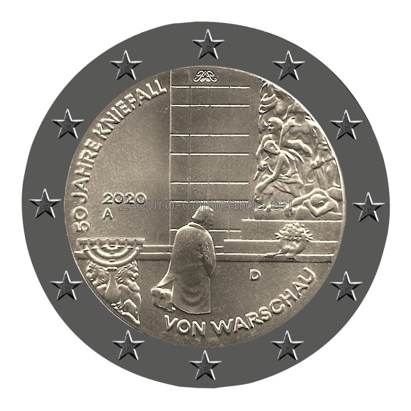 Na vzore je vyobrazený bývalý nemecký kancelár Willy Brantd, ako na znak pokory kľačí pred pomníkom hrdinov geta vo Varšave. Jeho silne obrazná kompozícia odkazuje na povstanie vo varšavskom gete v roku 1943. Na veľmi jemnom reliéfe vzoru sú vyobrazené výrečné symboly: sedemramenný svietnik, obete z geta, ako aj pokľaknutie. Vo vnútornej časti mince sú uvedené aj iniciály umelca (hore), značka mincovne, vyjadrená písmenami A, D, F, G alebo J, rok „2020“ (v strede vľavo), kód vydávajúcej krajiny Nemecko – „D“ (vpravo dole) a nápis „50 JAHRE KNIEFALL VON WARSCHAU“.