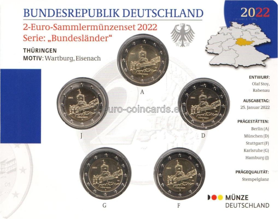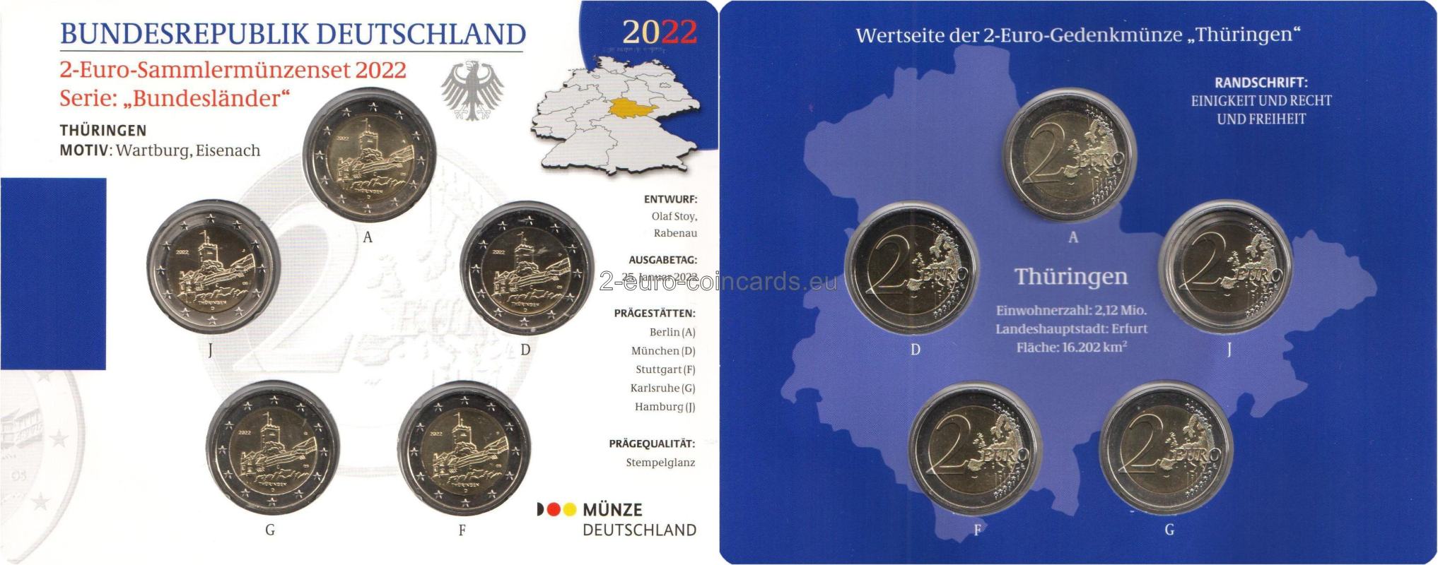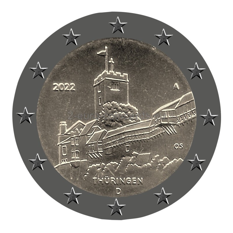 Na vzore je vyobrazený hrad Wartburg, prvý nemecký hrad zaradený do zoznamu svetového dedičstva UNESCO. Vo vnútornej časti mince sa nachádza názov „THÜRINGEN“ a pod ním kód vydávajúcej krajiny „D“. Na pravej strane je uvedená značka Značka mincovne, vyjadrená písmenami A, D, F, G alebo J, a značka rytca a na ľavej strane sa nachádza rok „2022“. Umelec: Olaf Stoy (Rabenau).