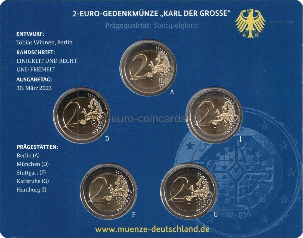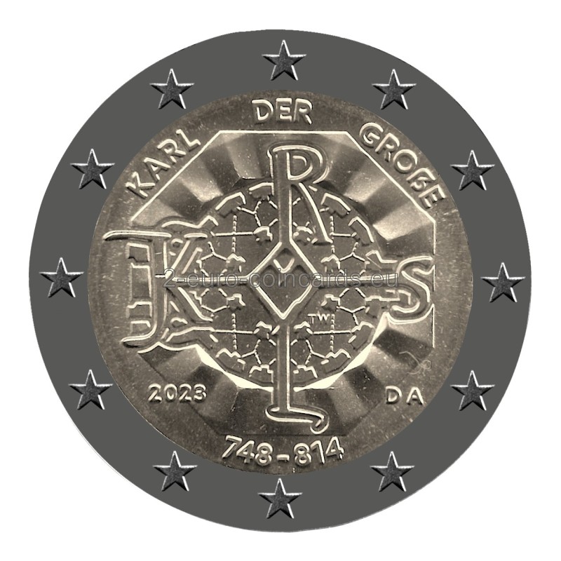 Vzor kombinuje dva súčasné prvky: osobný monogram Karola Veľkého a oktogón katedrály v Aachene. Obidva motívy sú obratne spojené do jedného umeleckého celku. Sila motívu spočíva v jeho dynamickej a trojdimenzionálnej povahe. Celkovo ide o inovatívne vzdanie pocty významnej osobnosti európskych dejín. Na vnútornom prstenci mince sa v hornej časti nachádza nápis „KARL DER GROßE“ (Karol Veľký) a v dolnej polovici je uvedený rok vydania „2023“, dátumy „748 – 814“, kód Nemecka ako vydávajúcej krajiny „D“, značka príslušnej mincovne, vyjadrená písmenami A, D, F, G alebo J, iniciály umelca Tobiasa Winnena „TW“.