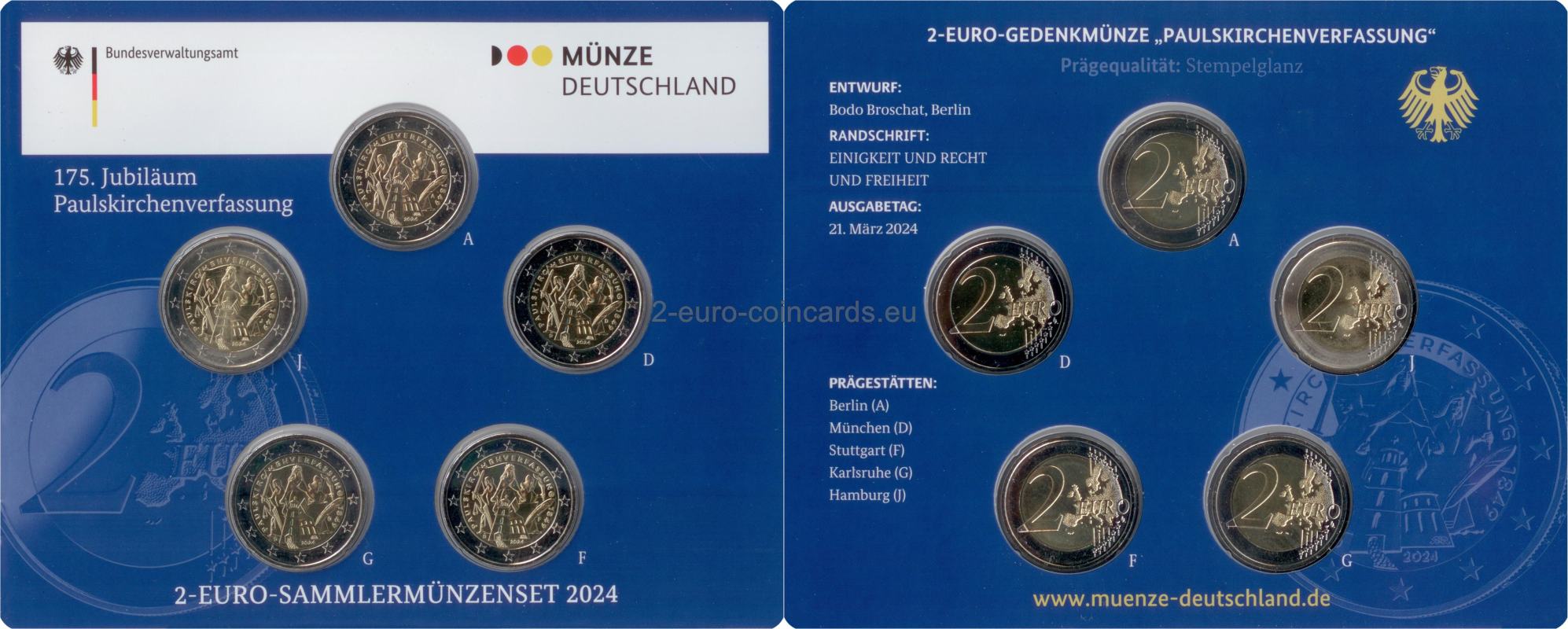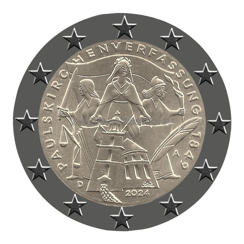 Návrh obsahuje niekoľko tematických vrstiev. V popredí je perspektívne zobrazený kostol sv. Pavla, do ktorého vchádzajú členovia národného ústavodarného zhromaždenia. Tento výjav prekrýva ústavnú listinu a brko, ktoré predstavujú výsledok rokovania Frankfurtského parlamentu. Návrh napokon korunujú tri ženské postavy, ktoré predstavujú alegóriu Jednoty, Spravodlivosti a Slobody, a trojfarebná čierno-červeno-zlatá vlajka. Dynamický trojrozmerný reliéf evokuje nadčasovosť základných demokratických princípov, ktoré boli po prvýkrát písomne zakotvené vo Frankfurtskej ústave. Na vnútornom prstenci mince sa nachádza aj nápis „PAULSKIRCHENVERFASSUNG 1849“ („Ústava kostola sv. Pavla 1849“) a v dolnej časti rok vydania „2024“, kód Nemecka ako vydávajúcej krajiny – „D“, značka príslušnej mincovne („A“, „D“, „F“, „G“ alebo „J“) a iniciály berlínskeho autora návrhu mince Boda Broschata.