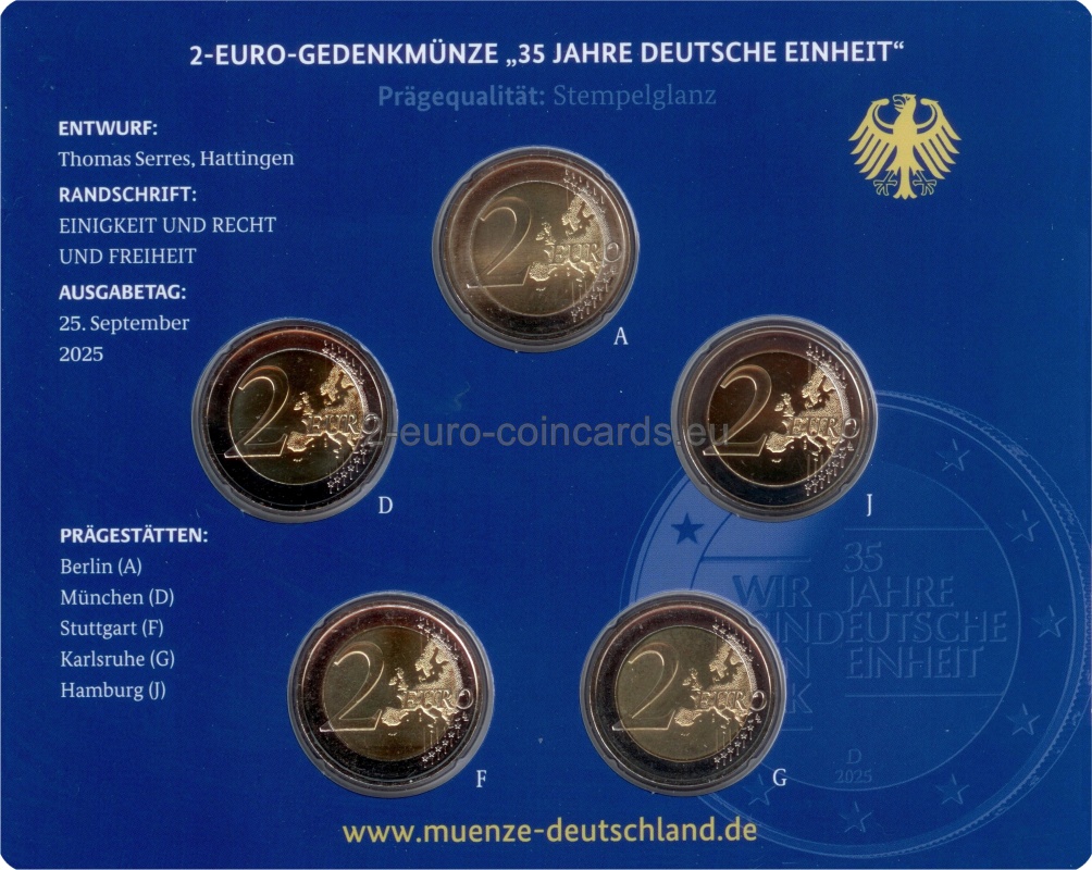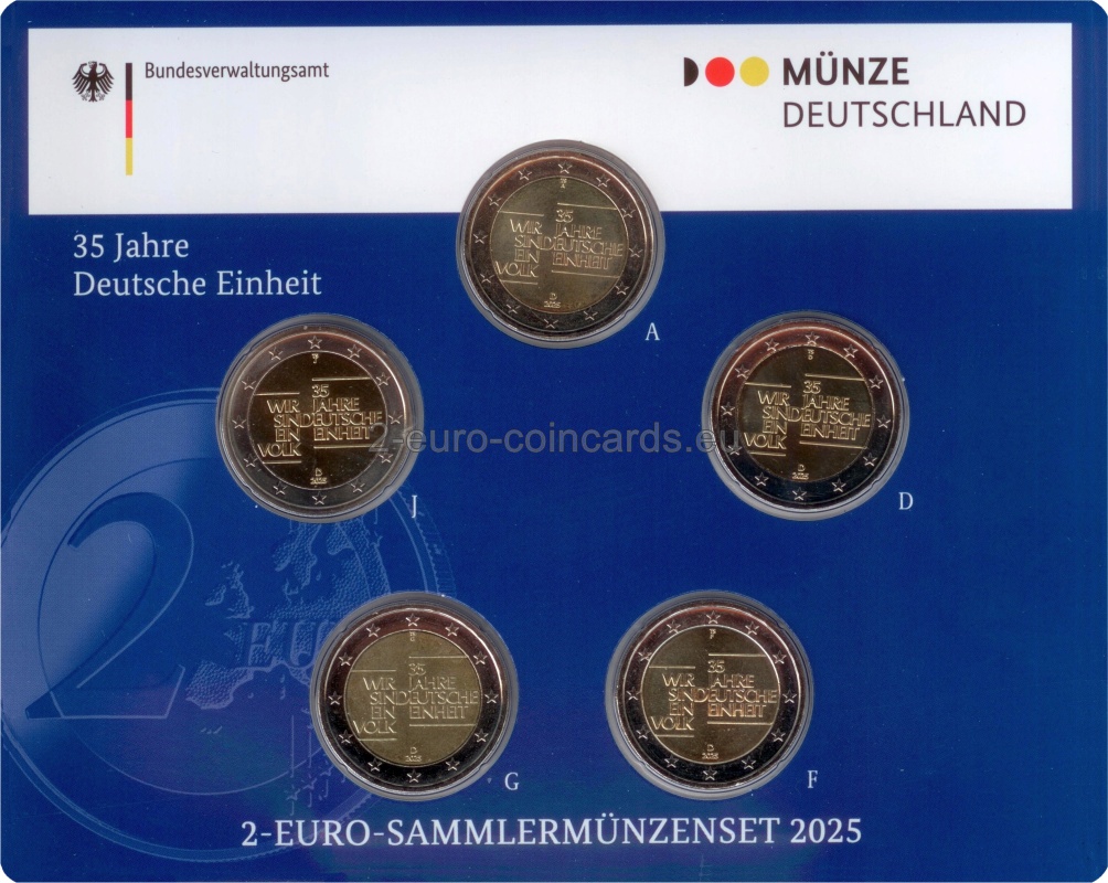 Na lícnej strane je nápis „WIR SIND EIN VOLK“. Táto veta znamená „Sme jeden národ“. Odkazuje na pokojné protesty pred pádom berlínskeho múru. Okrem toho je na ňom napísané „35 JAHRE DEUTSCHE EINHEIT“, čo v preklade znamená „35 rokov nemeckej jednoty“. V spodnej časti je uvedený letopočet "2025" a písmeno "D" označujúce vydávajúcu krajinu. V hornej časti iniciály TS označujú autora návrhu Thomasa Serresa.