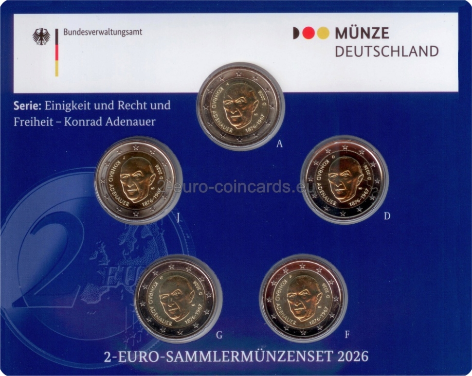 Na minci je zobrazený portrét Konrada Adenauera. V ľavej časti je značka mincovne a meno politika. V pravej časti je letopočet narodenia a úmrtia, skratka vydávajúcej krajiny "D" a rok vydania mince "2026".