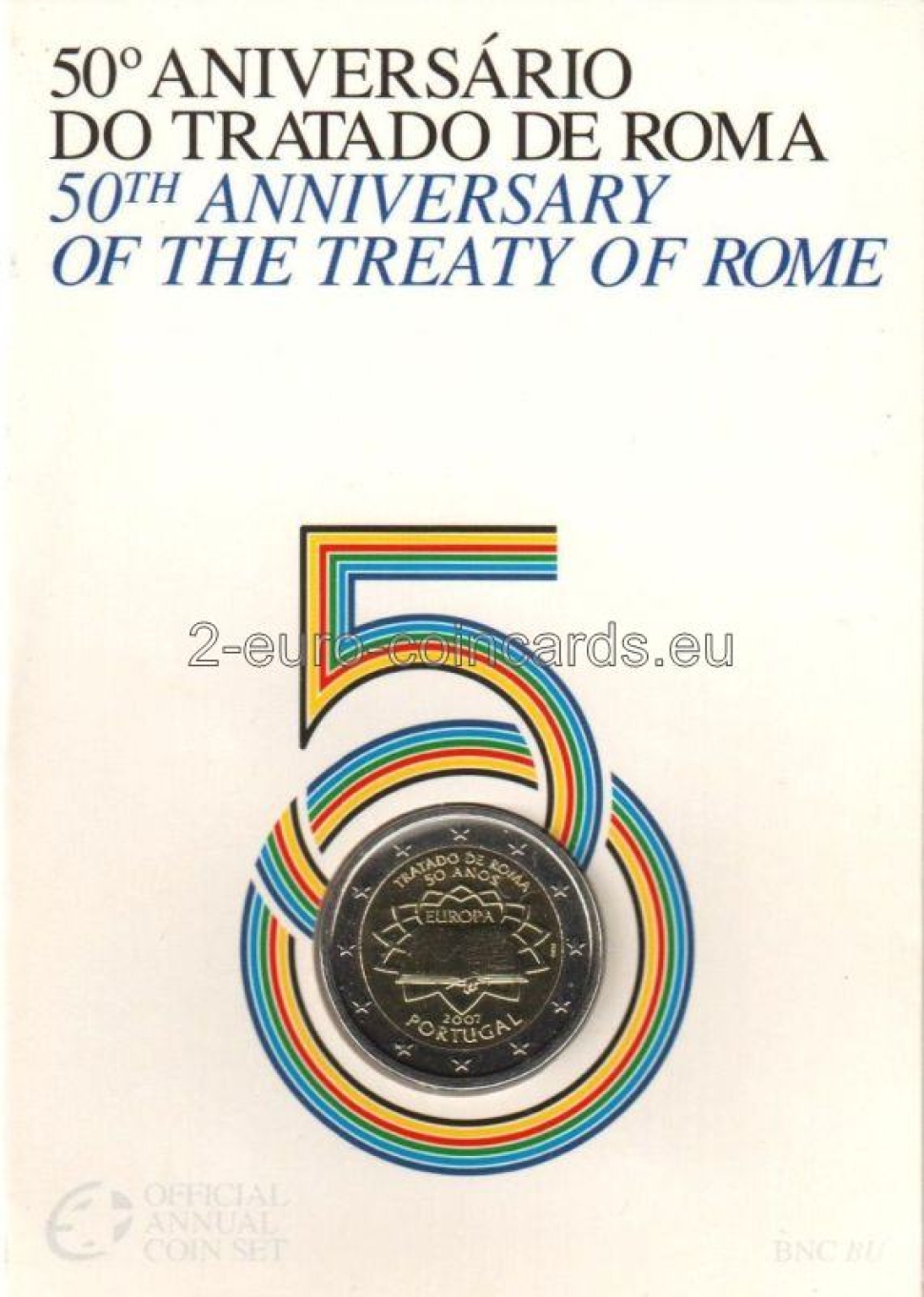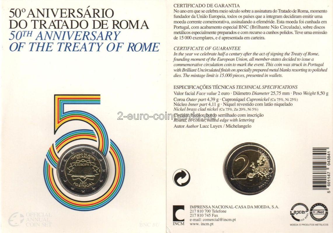 Preklad textu na obale: V roku, keď si pripomíname polstoročie od podpísania Rímskej zmluvy, ktorá bola zakladajúcim momentom Európskej únie, sa všetky členské štáty rozhodli vydať pamätnú obehovú mincu na pripomenutie tejto udalosti. Táto minca bola vyrazená v Portugalsku s povrchovou úpravou Brilliant Uncirculated na špeciálne pripravených kovových polotovaroch s využitím leštených razníc. Bola vydaná v náklade 15 000 kusov v kartičke peňaženkového formátu.