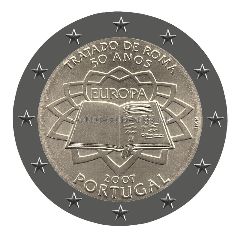 Stred mince zobrazuje Zmluvu podpísanú šiestimi zakladajúcimi členskými štátmi na pozadí evokujúcom dlažbu námestia Piazza del Campidoglio v Ríme, navrhnutú Michelangelom, kde bola 25. marca 1957 Zmluva podpísaná. Nad knihou sa je uvedený preklad slov „Treaty of Rome 50 years“ TRATADO DE ROMA/50 ANOS/EUROPA. Pod knihou je vpísaný rok 2007 a národná podoba názvu vydávajúcej krajiny "PORTUGAL". Vpravo je skratka Portugalskej mincovne - Imprensa Nacional (INCM).