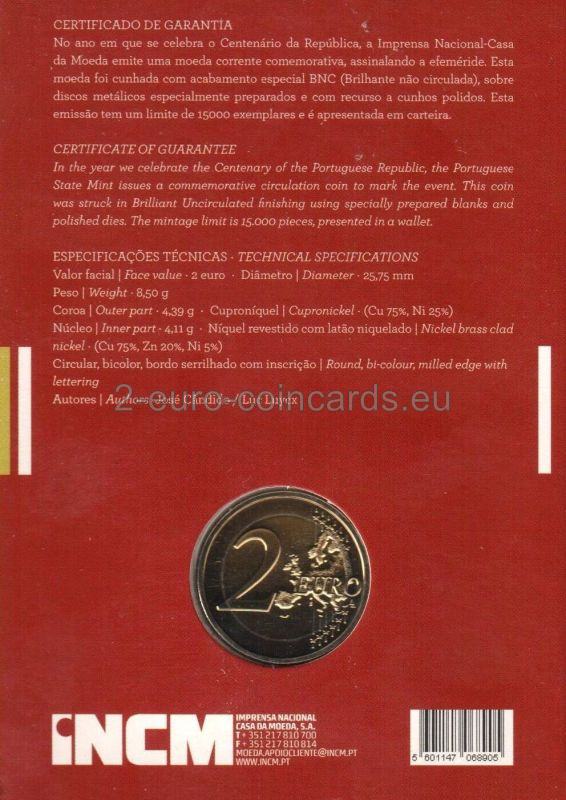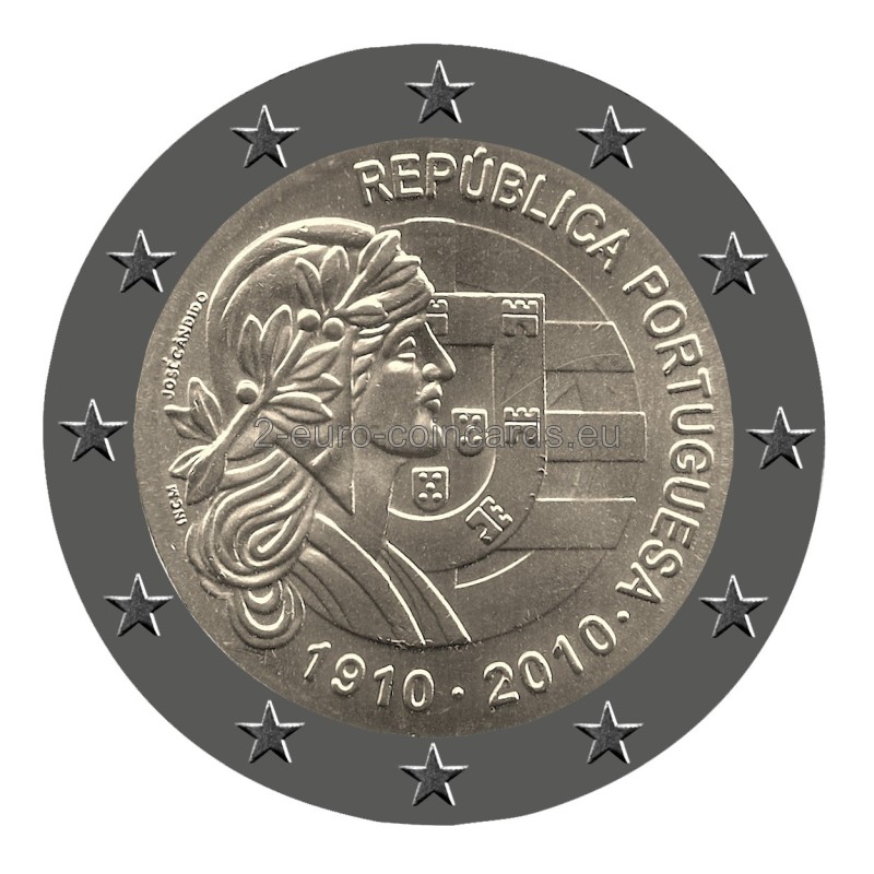 Minca pripomína 100. výročie pádu konštitučnej monarchie kráľa Manuela II. a vyhlásenie Portugalskej republiky po revolúcii z 5. októbra 1910. Na vnútornej časti mince je v strede zobrazený portugalský štátny znak a symbol „República“, čo sú dva najreprezentatívnejšie symboly Portugalskej republiky, okolo ktorých sa uvádza text „República Portuguesa – 1910 – 2010“, značka Portugalskej mincovne Imprensa Nacional "INCM" a meno autora „JOSE CÂNDIDO“.