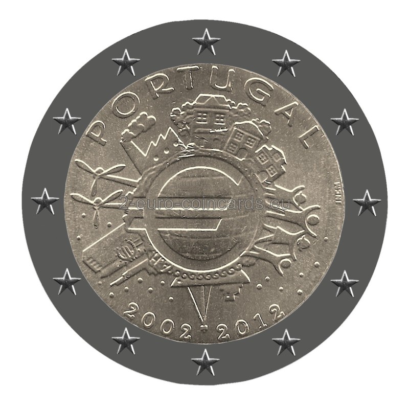 Znak eura v strede mince znamená, že euro sa stalo mimoriadne dôležitou súčasťou Európy, ale aj sveta, pretože sa v priebehu posledných 10 rokov stalo globálnym hráčom v rámci medzinárodného menového systému. Jednotlivé prvky motívu okolo symbolu eura na minci vyjadrujú význam eura pre ľudí, pre finančný svet (veža ECB), pre obchod (lode), priemysel (továrne), pre odvetvie energetiky, výskumu a vývoja (veterné elektrárne). Iniciály autora návrhu „A.H.“ sa dajú objaviť (ak sa pozriete veľmi pozorne) medzi loďou a budovou Eurotower. Pozdĺž horného okraja vnútornej časti mince je uvedená krajina vydania (PORTUGAL), zatiaľ čo označenie 2002 – 2012 je umiestnené v dolnej časti. Na pravej strane je zvislý znak Portugalskej mincovne Imprensa Nacional "INCM".