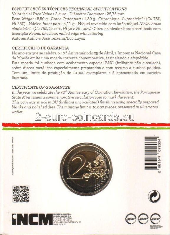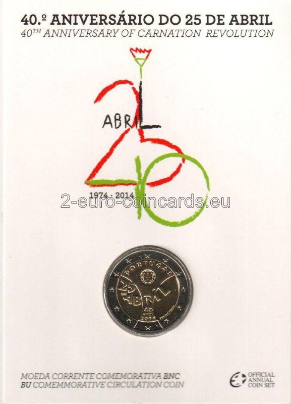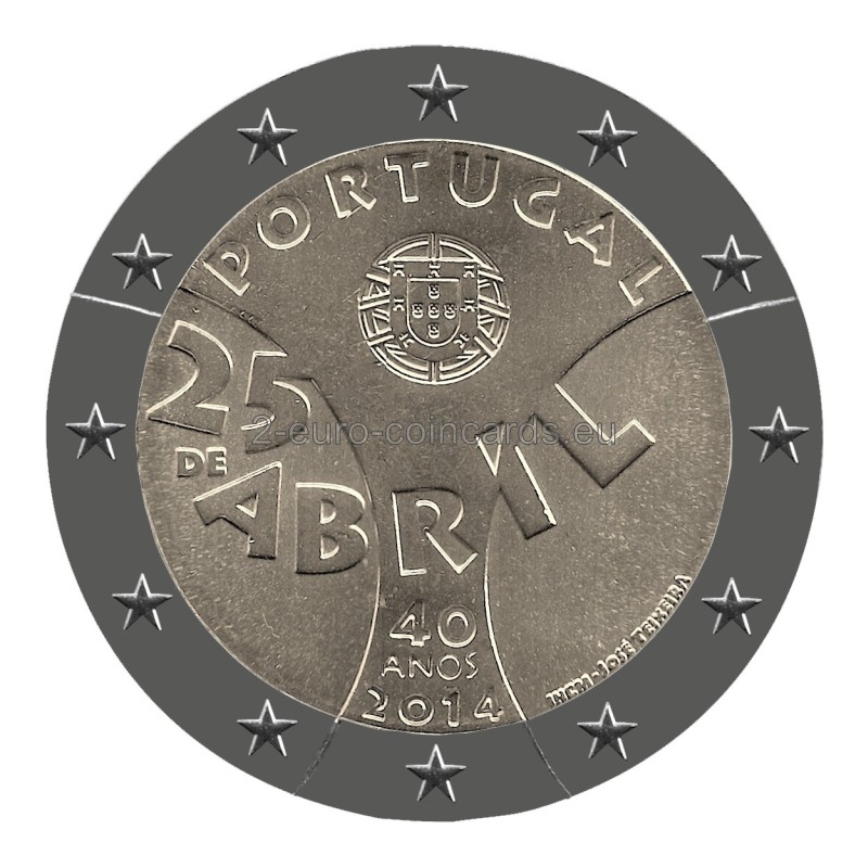 Dve krivky znázorňujú hrubý obrys karafiátu, kvetu, ktorý symbolizuje dané hnutie a z ktorého tiež vychádza názov revolúcie. Na hornej strane kvetu je vyrytý názov vydávajúcej krajiny „PORTUGAL“ a štátny znak. V strede motívu je uvedený dátum udalosti „25 DE ABRIL“ (25. apríla) a v dolnej časti počet rokov, ktoré od revolúcie uplynuli „40 ANOS“ (40 rokov) a rok vydania „2014“. Tvar písmen a číslic vychádza z tvaru, ktorý sa používal pred 40 rokmi na plagátoch a iných materiáloch s politickými informáciami, pričom má byť symbolom euforického obdobia, ktoré nasledovalo tesne po revolúcii. Značka Portugalskej mincovne Imprensa Nacional (INCM) a meno autora "JOSÉ TEIXEIRA" sú na pravom spodnom okraji.