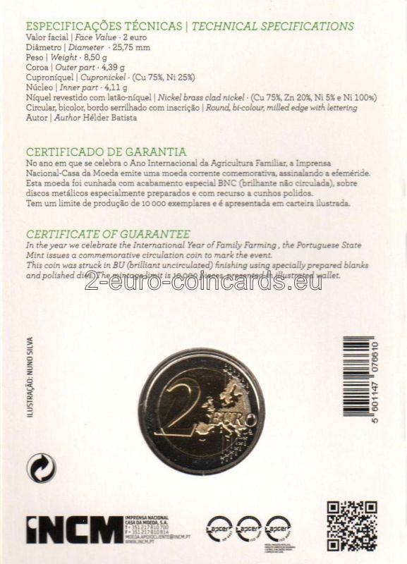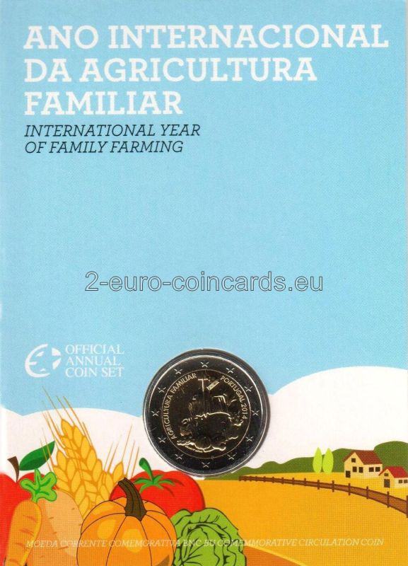 V strede motívu sú vyobrazené nástroje, ktoré sa bežne používajú v tradičnom poľnohospodárstve, spolu s poľnohospodárskymi produktmi: v strede kura obklopené tekvicami, košíkom zemiakov a inými druhmi zeleniny a kvetov. Na ľavej strane je v polkruhu uvedený pamätný motív „AGRICULTURA FAMILIAR“ (rodinné poľnohospodárstvo) a na pravej strane je v polkruhu uvedený názov vydávajúcej krajiny „PORTUGAL“ a za ním rok vydania „2014“. Vľavo dole je uvedená značka portugalskej mincovne Imprensa Nacional „INCM“ a meno autora "H. BATISTA".