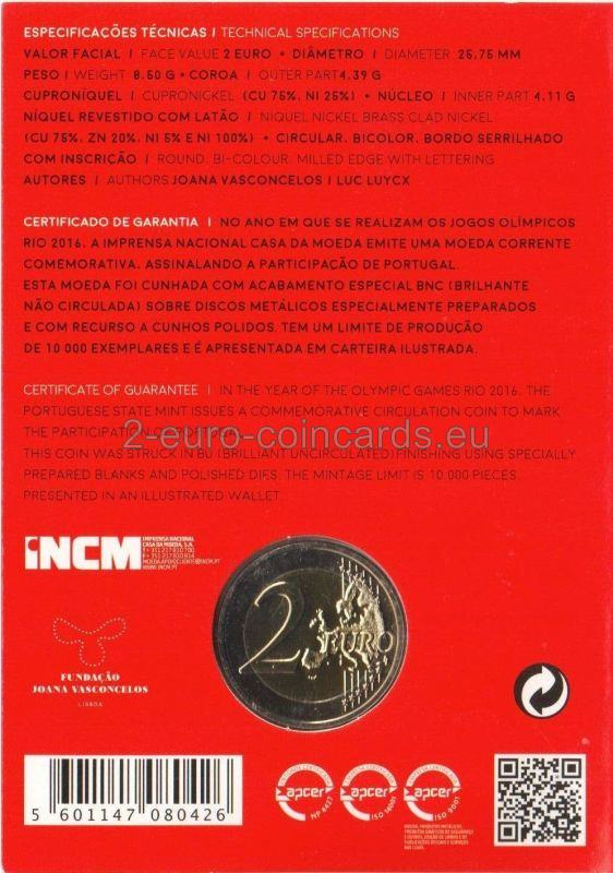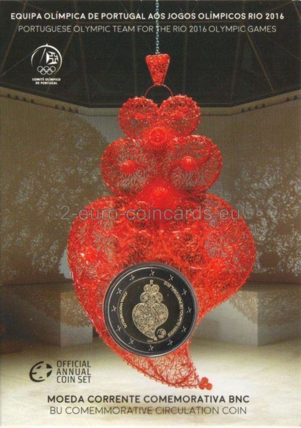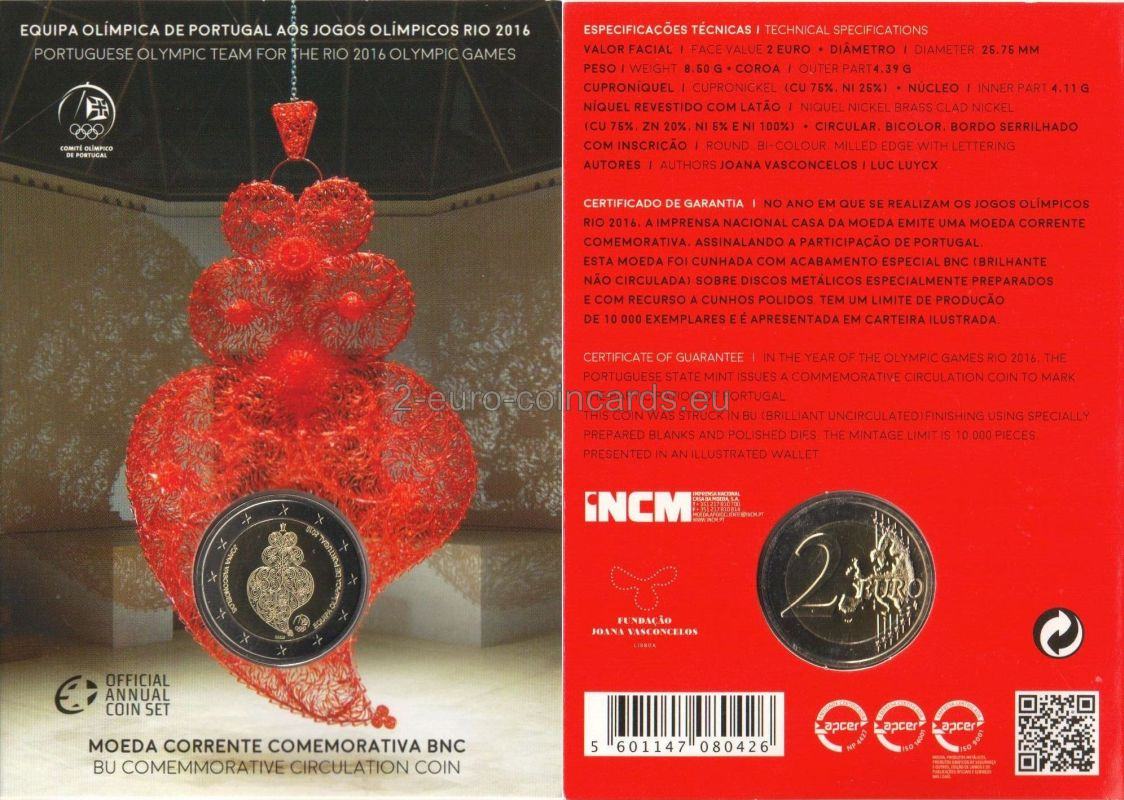 Na návrhu je zobrazené známe umelecké dielo podpísané autorkou Joannou Vasconcelos nazvané „Srdce z Viany“, ktoré je inšpirované tradičnými klenotmi zo severného Portugalska (v okolí mesta Viana do Castelo). Symbolizuje podporu Portugalcov ich národnému tímu pri príležitosti olympijských hier. Na ľavej strane je do polkruhu uvedené meno autora „JOANA VASCONCELOS“ a na pravej strane „EQUIPA OLÍMPICA DE PORTUGAL 2016“ (PORTUGALSKÝ OLYMPIJSKÝ TÍM 2016). Dole je uvedená značka Portugalskej mincovne Imprensa Nacional „INCM“.