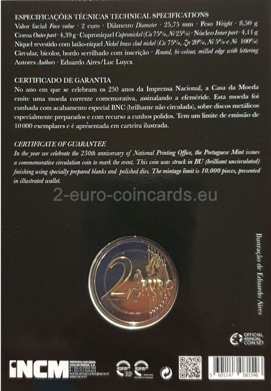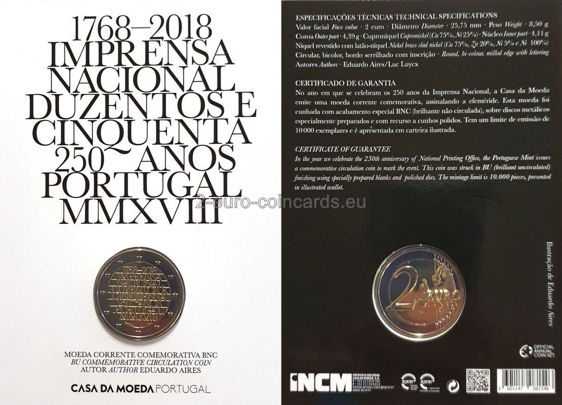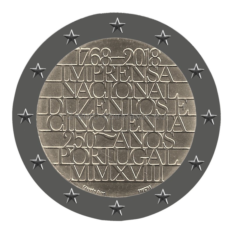 Na minci je zobrazený nápis „1768-2018 IMPRENSA NACIONAL DUZENTOS E CINQUENTA 250 ANOS PORTUGAL MMXVIII“, pričom písmená a čísla nápisu predstavujú knihy vystavené v knižnici. V dolnej časti vnútorného kruhu je na ľavej strane uvedené meno umelca „Eduardo Aires“ a na pravej strane značka mincovne „INCM“. Národná tlačiareň je zodpovedná za vydávanie Portugalského úradného vestníka, v ktorom je uvedená všetka legislatívna činnosť krajiny, ako aj kultúrne najvýznamnejšie knižné publikácie a iné kultúrne činnosti.
