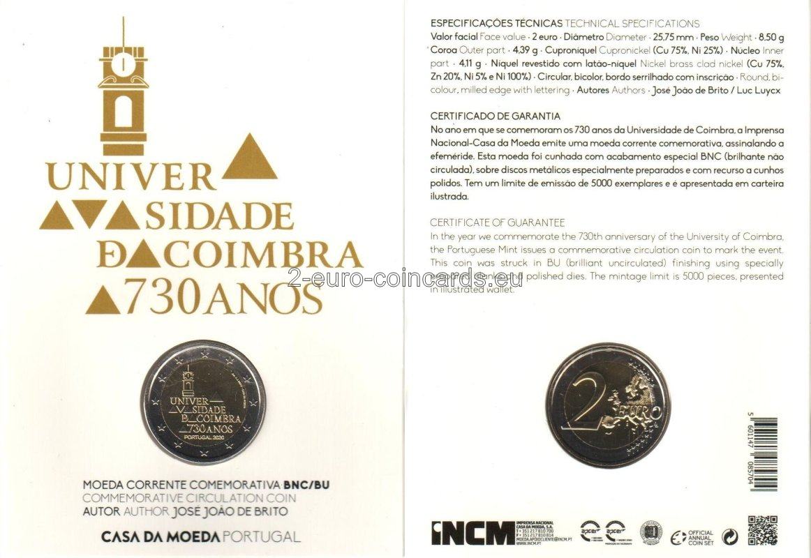 Na vzore je vyobrazená veža Univerzity v Coimbre a kompozícia trojuholníkov predstavujúcich strechy Univerzity v Coimbre, pričom najvyšší trojuholník znázorňuje knižnicu Joanina, spolu s nápisom „UNIVERSIDADE DE COIMBRA 730 ANOS PORTUGAL 2020“ (v preklade UNIVERZITA V COIMBRE 730 ROKOV PORTUGALSKO 2020). Vpravo hore je podpis autora mincovne "Esc.J.J. BRITO" a označenie mincovne "Casa da Moeda".
