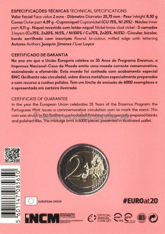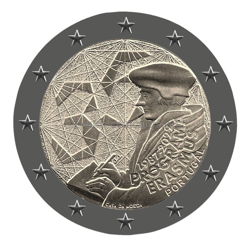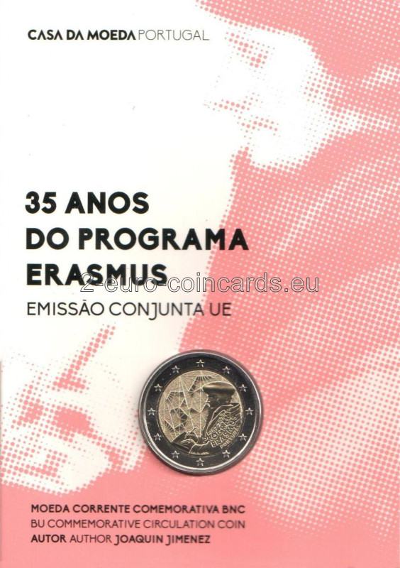 Návrh je kombináciou dvoch hlavných prvkov programu Erasmus: pôvodná intelektuálna inšpirácia, samotný Erasmus a alegória jeho vplyvu na Európu. Prvú symbolizuje jedno z najznámejších vyobrazení Erasma. Druhý je symbolizovaný zväzkom lúčov predstavujúcim väzby, ktoré prechádzajú naprieč mincou od jedného svetelného zdroja k druhému a reprezentujú množstvo intelektuálnych a ľudských výmen medzi európskymi študentkami a študentmi. Ako odkaz na Európu niektoré z týchto lúčov tvoria iné hviezdy, ktoré vznikli vďaka synergiám medzi krajinami. Medzi líniami sú tiež iniciály autora mince "J.J." (Joaquin Jimenez). Číslo 35, zodpovedajúce tridsiatemu piatemu výročiu, vystupuje z hviezd v modernom grafickom štýle. V spodnej časti je značka mincovne "CASA DA MOEDA".
