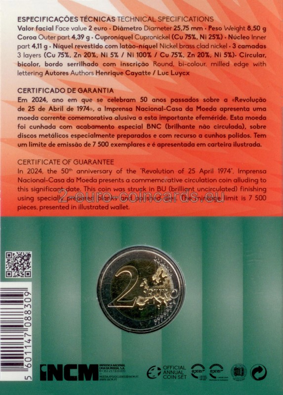 V strede národnej strany mince je karafiát symbolizujúci revolúciu, obklopený mnohými excentrickými kruhmi, ktoré naznačujú, že činy a presvedčenia ľudí sa môžu v priebehu rokov meniť, ale v podstate zostávajú verné princípom revolúcie. Na pravom okraji je verš „Esta é a madrugada que eu esperava“ (Toto je úsvit, na ktorý som čakala) a meno jeho autorky, poetky Sophii de Mello Breiner Andresen; vľavo je uvedené meno autora návrhu a značka portugalskej mincovne "Casa da Moeda".