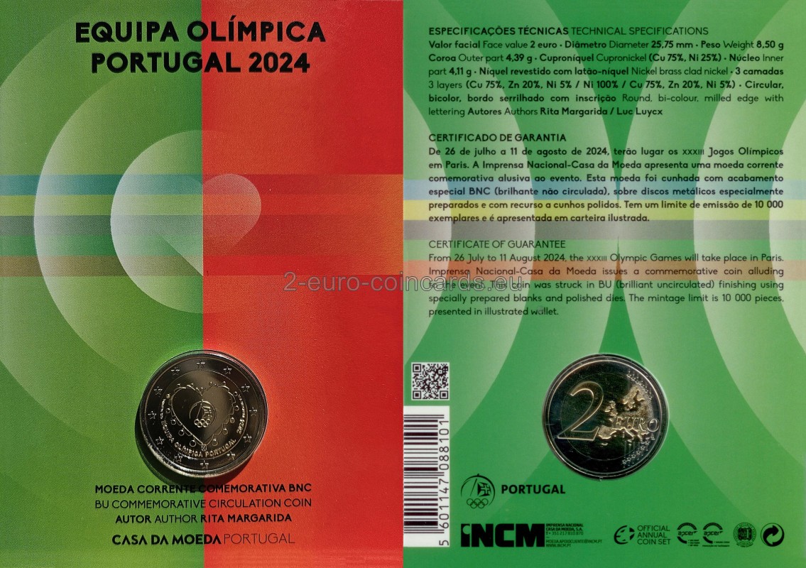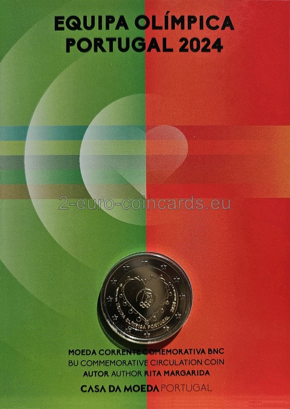 Na národnej strane mince je súbor prvkov v tvare srdca, symbolizujúcich kolektívne objatie; okolo srdca je 15 kruhov symbolizujúcich olympijské kruhy a kontinenty, ktoré predstavujú, špička srdca je korunovaná erbom Portugalska; V strede "objatia" je logo Portugalského olympijského výboru, ktoré vyjadruje myšlienku, že srdcia Portugalcov budú kolektívne biť pre portugalský olympijský tím na olympijských hrách v Paríži 2024. Nižšie je uvedený názov "Equipa Olímpica Portugal". a rok "2024"; Vľavo je značka mincovne "Casa da Moeda" a vpravo meno autora návrhu. Špeciálna verzia s povrchovou úpravou Proof bude mať farebné prvky.