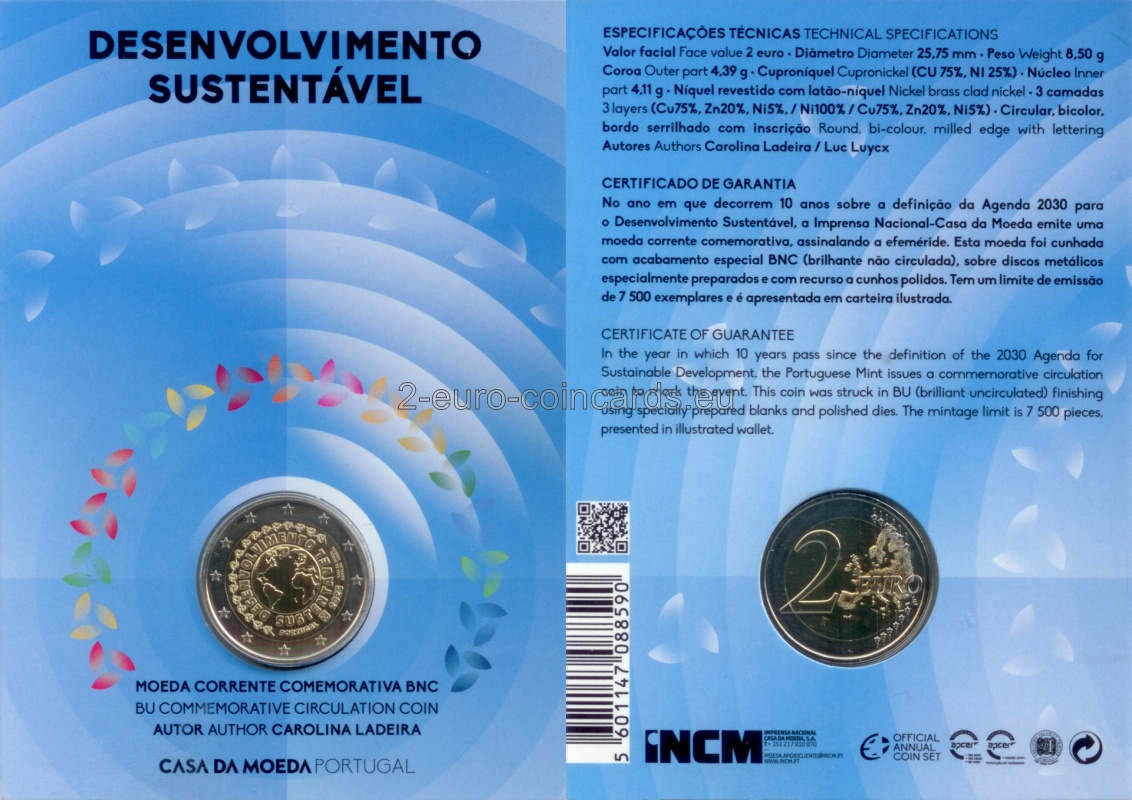 Na lícnej strane mince je štylizovaný glóbus ktorý je obklopený radom malých lístkov predstavujúcich prírodu a život. Tieto listy tvoria kruh, ktorý symbolizuje harmóniu a kolobeh udržateľnosti. Okolo zemegule je kruhový nápis „DESENVOLVIMENTO SUSTENTÁVEL“, čo vo portugalčine znamená „Udržateľný rozvoj“. V spodnej časti mince sa nachádza názov vydávajúcej krajinu „PORTUGAL“. Vedľa napravo je portugalský štátny znak a rok vydania „2025“. Na pravom okraji je názov portugalskej mincovne „CASA DA MOEDA“ a meno autora návrhu „CATARINA LAGEIRA“.