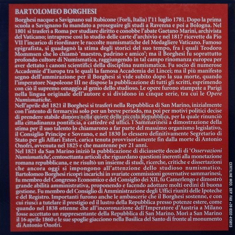 Taliansky vedec Bartolomeo Borghesi bol kľúčovou osobnosťou pri formovaní numizmatiky ako vedy. Borghesi sa narodil 11. júla 1781 v Savignano sul Rubicone pri Rimini. Bol to nadaný chlapec, už ako 9-ročný písal grécky a latinsky. Ako 11-ročný vypracoval prácu o bronzovej medaile cisára Herakleia. Sláva mladého talentu sa rozšírila aj do jeho rodného mesta. Hoci sa dá predpokladať, že jeho prvé práce ovplyvnil jeho otec, uznávaný numizmatik. Po otcovej smrti v roku 1794 bol Borghesi poslaný pokračovať v štúdiu do Ravenny a Bologne, kde sa venoval filozofii a filológii. Neskôr pokračoval v štúdiu v Ríme, kde pre pápeža Pia VII katalogizoval niekoľko numizmatických zbierok vrátane vatikánskej zbierky. Okrem toho začal jednu zo svojich najvýznamnejších prác - v rokoch 1818 - 1820 zbieral nápisy na antických minciach a dešifroval ich. Vzniklo tak monumentálne dielo "Nuovi Frammenti dei Fasti Consolari Capitolini", ktorým si získal úctu vedcov na celom svete a ktoré poslúžilo ako základ pre chronológiu rímskych dejín. Bartolomeo Borghesi bol členom mnohých európskych akadémií. V roku 1821 sa Borghesi kvôli nepokojnej politickej situácii v krajine presťahoval do San Marína. Po získaní nového občianstva zastával rôzne verejné funkcie vrátane štátneho tajomníka pre zahraničné veci, člena verejnej univerzity, štátneho pokladníka a člena Rady dvanástich. Mal aj rôzne úlohy ako veľvyslanec. V San Maríne začal Borghesi vydávať 17 zväzkov svojich Osservazioni numismatiche (Numizmatické poznámky). Uverejnil tiež 170 článkov o razbe mincí v Rímskej republike. Tieto práce majú pre vedeckú numizmatiku veľký význam aj dnes. V roku 1838 ho zástupca Sanmarínskej republiky pozval do Milána na korunováciu Ferdinanda I. za lombardsko-benátskeho kráľa. Pod Borghesiho vedením vzniklo Sanmarínske múzeum so zbierkou obrazov, archeologických nálezov, keramiky a sôch. Borghesi bol jedným z autorov ambiciózneho projektu, zbierky všetkých latinských nápisov antického sveta. Dielo vzniklo pod záštitou Berlínskej akadémie vied a dostalo názov Corpus Inscriptionum Latinarum. Vydávanie nových zväzkov stále prebieha. Borghesi zomrel 16. apríla 1860 a bol pochovaný vo Svätej bazilike. Zanechal po sebe veľké množstvo vedeckých prác, ktoré sú dodnes aktuálne, a žiakov, ktorí pokračovali v jeho vedeckom výskume. Po Borghesiho smrti Napoleon III. ako uznanie jeho veľkého vedeckého prínosu nariadil vydať kompletné vydanie učencových prác. Toto vydanie v desiatich zväzkoch sa začalo v roku 1862 a bolo dokončené až v roku 1897.