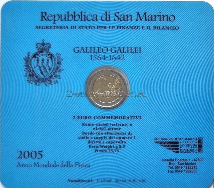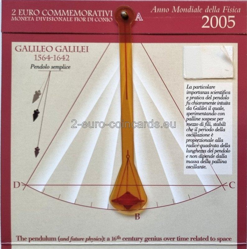 Rok 2005 vyhlásilo Valné zhromaždenie OSN za Medzinárodný rok fyziky (rezolúcia 58/293 z 10. júna 2004). Pripomínalo sa ním 100. výročie publikovania vedeckej práce Alberta Einsteina (1879 - 1955) v roku 1905, ktorá položila základy troch dôležitých odvetví fyziky: teórie relativity, kvantovej teórie a teórie Brownovho pohybu. Tieto práce dali impulz, krok od klasickej mechaniky ku kvantovej elektronike, laserovej fyzike a ďalším odvetviam modernej fyziky, na ktorých je založený najnovší vývoj vo všetkých oblastiach ľudskej činnosti. V rámci Medzinárodného roka fyziky sa konali najrôznejšie výstavy, súťaže a demonštrácie. Ich cieľom bolo pomôcť pochopiť modernú úlohu fyziky pri tvorbe väčšiny už existujúcich technológií a pri riešení takých dôležitých problémov, ako je hľadanie nových zdrojov energie, ochrana životného prostredia a zdravia ľudí. Koniec koncov, vedu je potrebné priblížiť a ľahšie pochopiť miliónom ľudí na celom svete. Jedným z cieľov Medzinárodného roka fyziky bolo vzbudiť pochopenie významu vedeckých poznatkov v modernej spoločnosti. Zapojiť mladých ľudí do vedy, do najnovších objavov a úspechov, objaviť ich priekopnícky talent pre nové technológie. Veď fyzika zohráva dôležitú úlohu nielen v rozvoji vedy a techniky, ale má aj obrovský vplyv na našu spoločnosť. Minca je venovaná talianskému filozofovi, fyzikovi, astronómovi, matematikovi obdobia renesancie, jeden zo zakladateľov súčasnej experimentálno-teoretickej prírodovedy Galieo Galileovi. Prvý v histórii rozpracoval teóriu kyvadiel. Dokázal, že perióda závisí iba od dĺžky, nie od amplitúdy alebo hmotnosti kyvadla.
