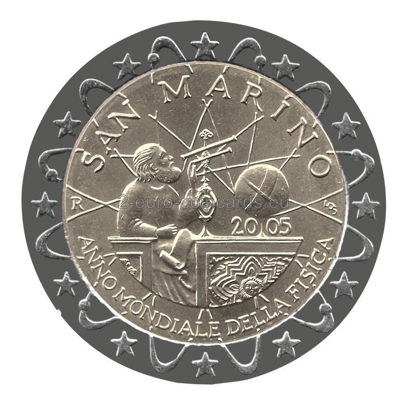 Na vnútornom disku je alegorický reliéf z florentskej katedrály Santa Maria del Fiore od Andreu Pisana (14. storočie) známy ako „la fisica antica“: Galileo Galilei pozoruje hviezdy. Pod glóbusom na Galileiho stole je uvedený rok vydania mince "2005". V hornej časti kruhu je uvedený názov vydávajúceho štátu "SAN MARINO". V dolnej časti je text: "ANNO MONDIALE DELLA FISICA" (MEDZINÁRODNÝ ROK FYZIKY). Vľavo je značka mincovne (písmeno "R") a vpravo značka umelca "LDS".