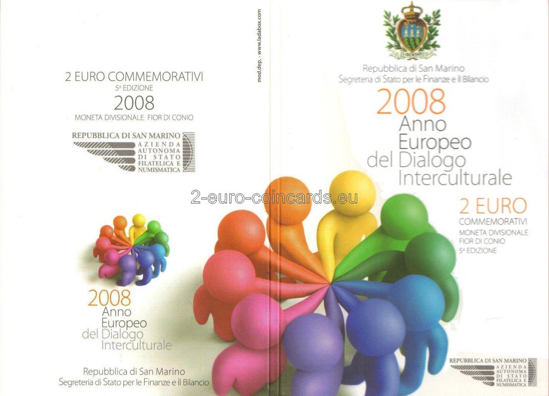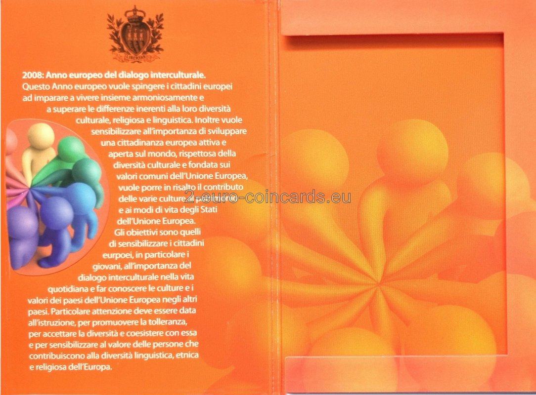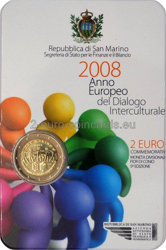 Na vnútornom disku je päť ľudských postáv na zemeguli, ktoré symbolizujú kultúry piatich kontinentov žijúcich v Európe. V popredí sú posvätné texty štyroch náboženstiev v podobe kníh. Nad obrazom je názov vydávajúcej krajiny "SAN MARINO" a pod ním rok vydania "2008". V spodnej časti je polkruhový text: "ANNO EUROPEO DEL DIALOGO INTERCULTURALE" ("EURÓPSKY ROK INTERKULTÚRNEHO DIALÓGU", it.). Vľavo je značka mincovne (písmeno "R"), vpravo značka umelca (iniciály "E.L.F.").