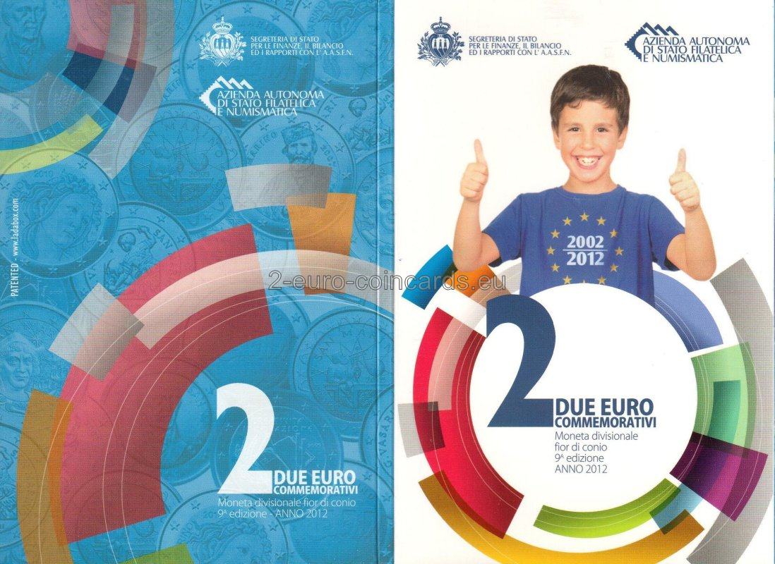 Znak eura v strede mince znamená, že euro sa stalo mimoriadne dôležitou súčasťou Európy, ale aj sveta, pretože sa v priebehu posledných 10 rokov stalo globálnym hráčom v rámci medzinárodného menového systému. Jednotlivé prvky motívu okolo symbolu eura na minci vyjadrujú význam eura pre ľudí, pre finančný svet (veža ECB), pre obchod (lode), priemysel (továrne), pre odvetvie energetiky, výskumu a vývoja (veterné elektrárne). Iniciály autora návrhu „A.H.“ sa dajú objaviť (ak sa pozriete veľmi pozorne) medzi loďou a budovou Eurotower. Pozdĺž horného okraja vnútornej časti mince je uvedená krajina vydania (SAN MARINO), zatiaľ čo označenie 2002 – 2012 je umiestnené v dolnej časti.