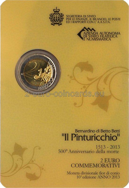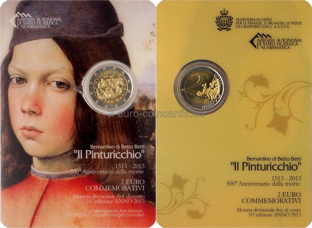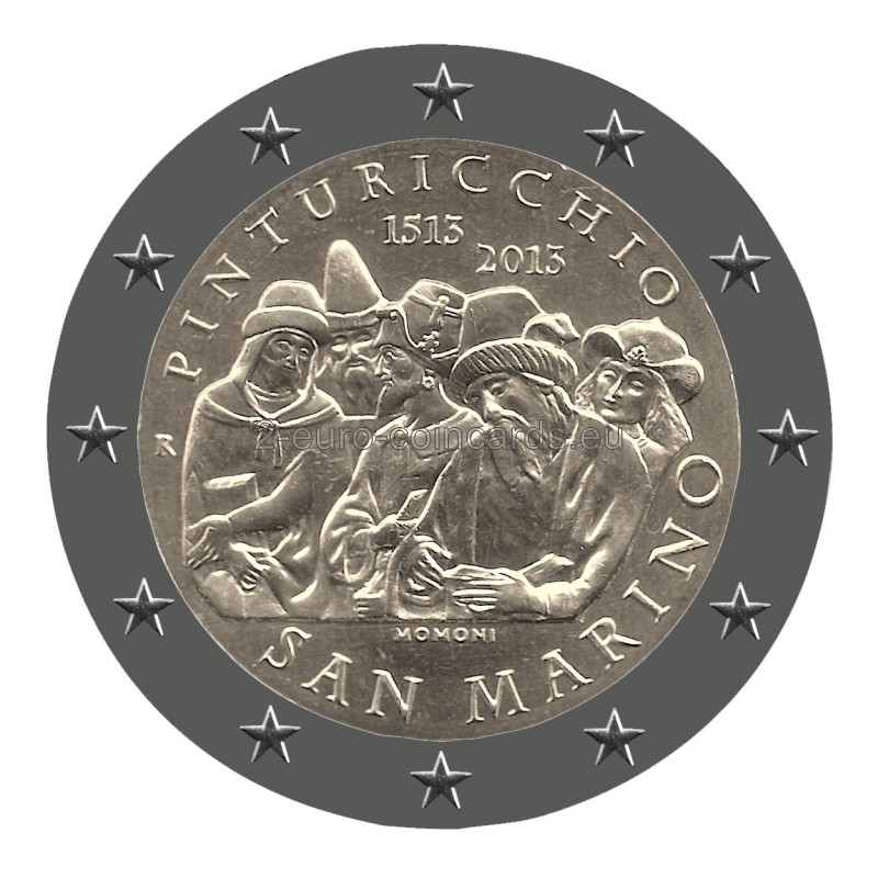 V popredí je znázornená freska „Ježiš v rozprave s učencami“, v spodnej časti je v polkruhu uvedený nápis „SAN MARINO“, vľavo sa nachádza značka talianskej mincovne „R“. Pod freskou je meno autorky návrhu „MOMONI“, nad freskou je v polkruhu uvedený nápis „PINTURICCHIO“ a pod ním roky „1513“ a „2013“.