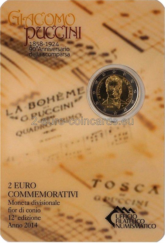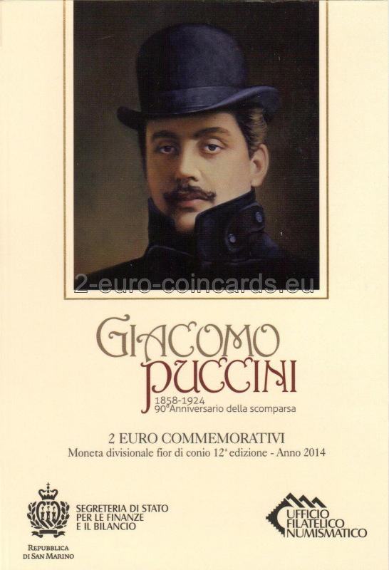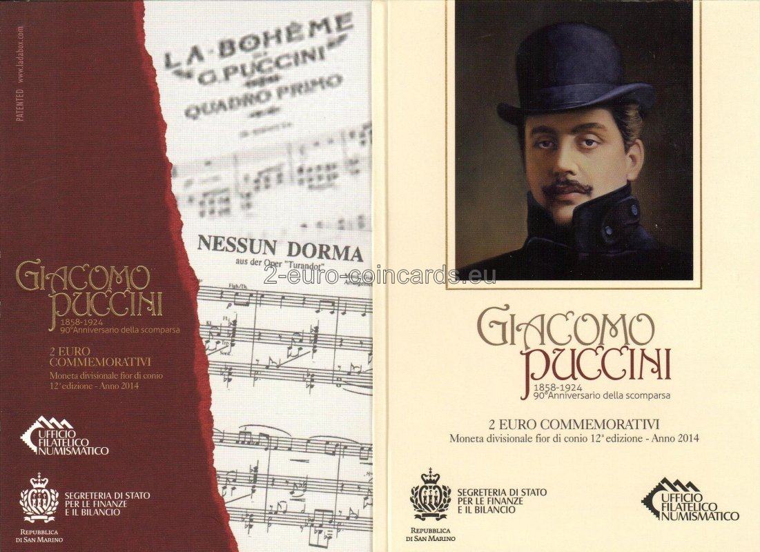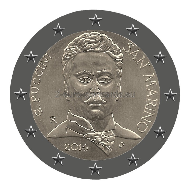 Na vnútornom disku je portrét G. Pucciniho podľa známej fotografie z roku 1900. V pravej časti je v polkruhu uvedený názov vydávajúcej krajiny „SAN MARINO“. V ľavej časti je uvedený nápis „G. PUCCINI“ a značka mincovne "R". V spodnej časti je uvedený rok „2014“ a vpravo iniciály autora "UP".
