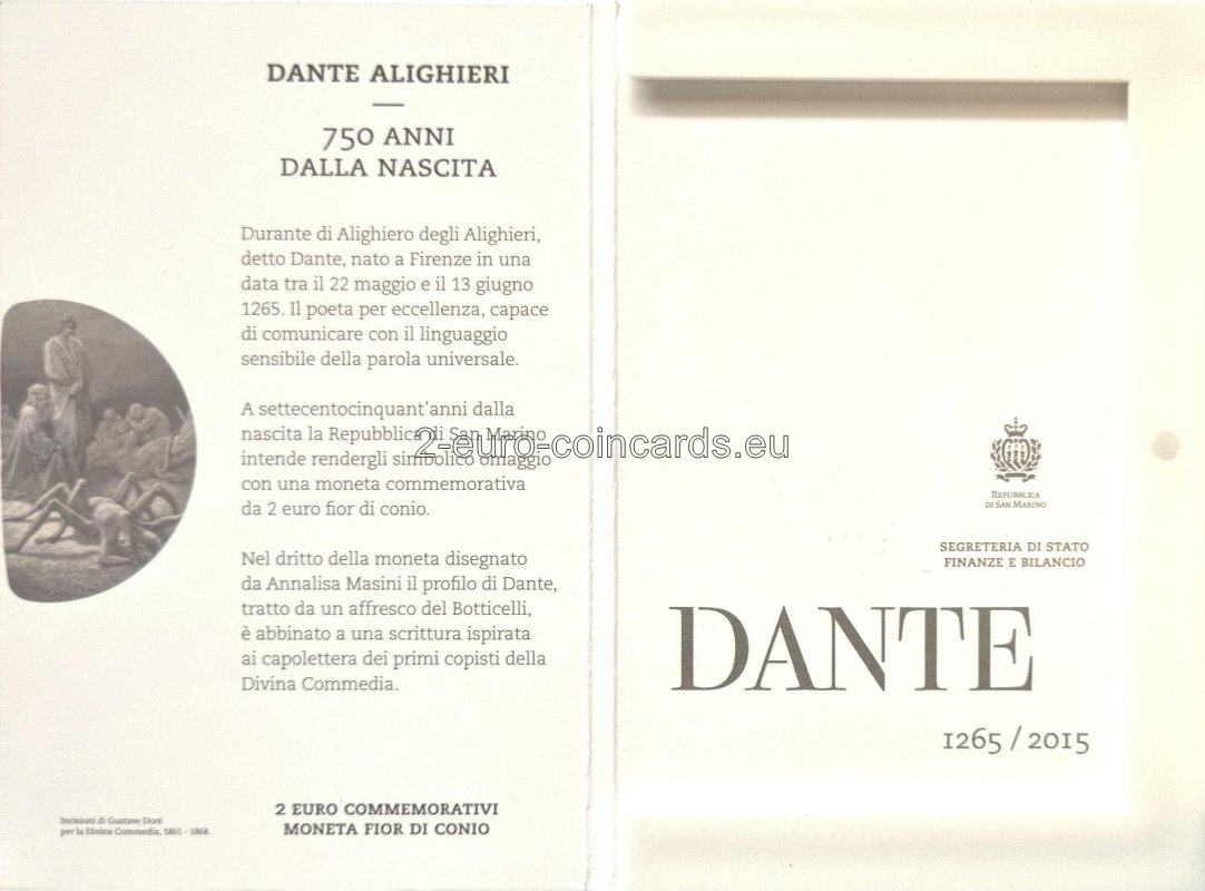 Vzor, ktorý vytvorila Annalisa Masiniová zobrazuje portrét Danteho prevzatý z fresky od Botticelliho. Vpravo od portrétu sa na zvislej osi nachádza nápis „DANTE“. Vpravo od vnútorného stredu je názov vydávajúceho štátu „SAN MARINO“ v polkruhu. Medzi týmito dvomi nápismi je značka mincovne „R“, roky „1265“ a „2015“ a iniciály umelkyne „AM“. Štýl písma použitý na označenie štátu a motívu mince bol inšpirovaný tvarom písma v prvých vydaniach diela Divina Commedia (Danteho Božskej komédie).