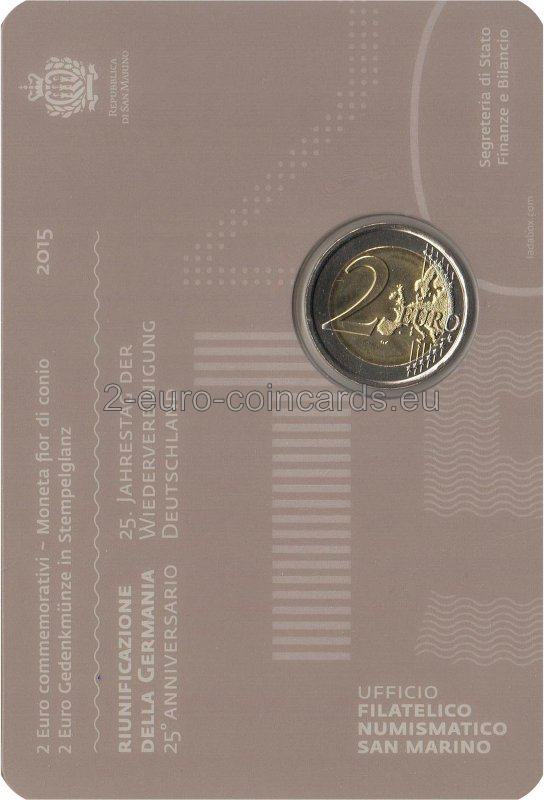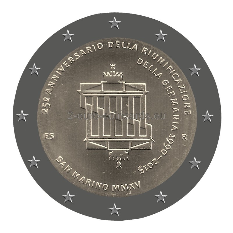 Návrh zobrazuje Brandenburskú bránu, ktorá sa počas studenej vojny nachádzala vo východnom Berlíne, v dvoch vyobrazeniach, ktoré sú navzájom prepletené ako dve spojené ruky, čo symbolizuje znovuzjednotenie oboch častí Berlína. Naľavo sa nachádza značka mincovne „R“ a iniciály umelca „ES“ (Erik Spiekermann). V kruhu okolo motívu je vyrazený nápis „25o ANNIVERSARIO DELLA RIUNIFICAZIONE DELLA GERMANIA 1990-2015“ (25. výročie znovuzjednotenia Nemecka) a krajina a rok vydania „San Marino MMXV“.