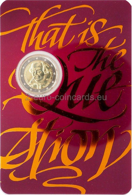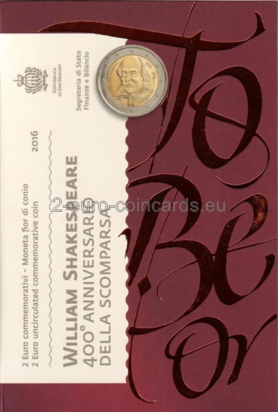 Vzor znázorňuje portrét básnika. Na pravej strane sú v polkruhu uvedené dátumy „1616 – 2016“ a názov vydávajúcej krajiny „San Maríno“; vpravo dolu sa nachádzajú iniciály umelca „MB“. Vľavo je v polkruhu uvedený nápis „William Shakespeare“; vľavo dolu je umiestnená značka mincovne „R“.
